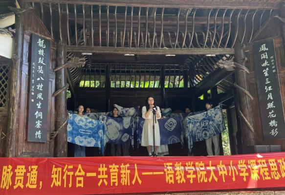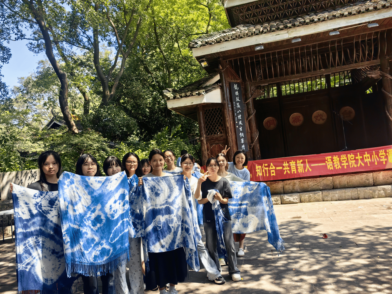 走进侗寨,开展“扎染非遗韵染共传·英语赋能文化出圈”体验活动。学生从扎染历史、染料来源、扎结技法、图案内涵、传承挑战等八个方面,用英语进行深入讲解与传播。各组介绍角度新颖、贴近实践,生动传递了非遗技艺所蕴含的生态智慧与匠心精神,也展现了学生的思考与创新意识。