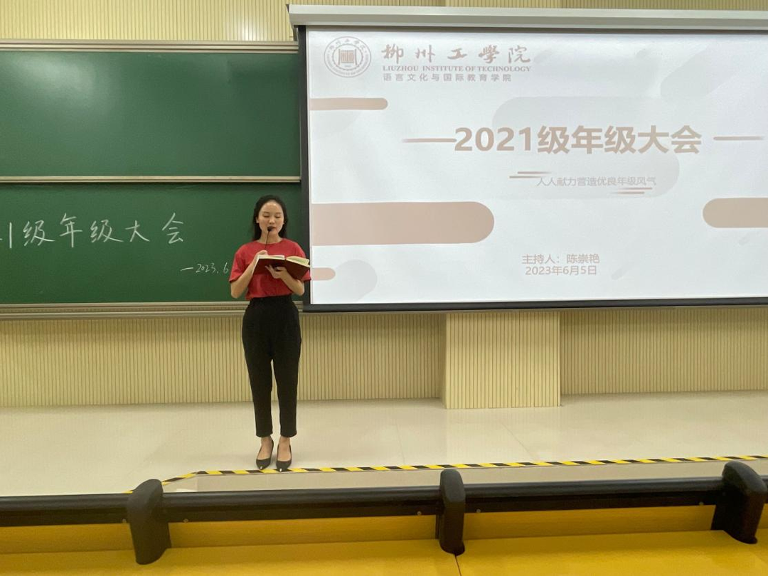 为营造优良学风,提升学生安全防范意识,6月5日语言文化与国际教育学院于北校区T1-101开展了年级大会。学院党总支书记杨新建、副书记邓先超以及21级全体同学参加此次会议,本次大会由辅导员陈崇艳老师主持。