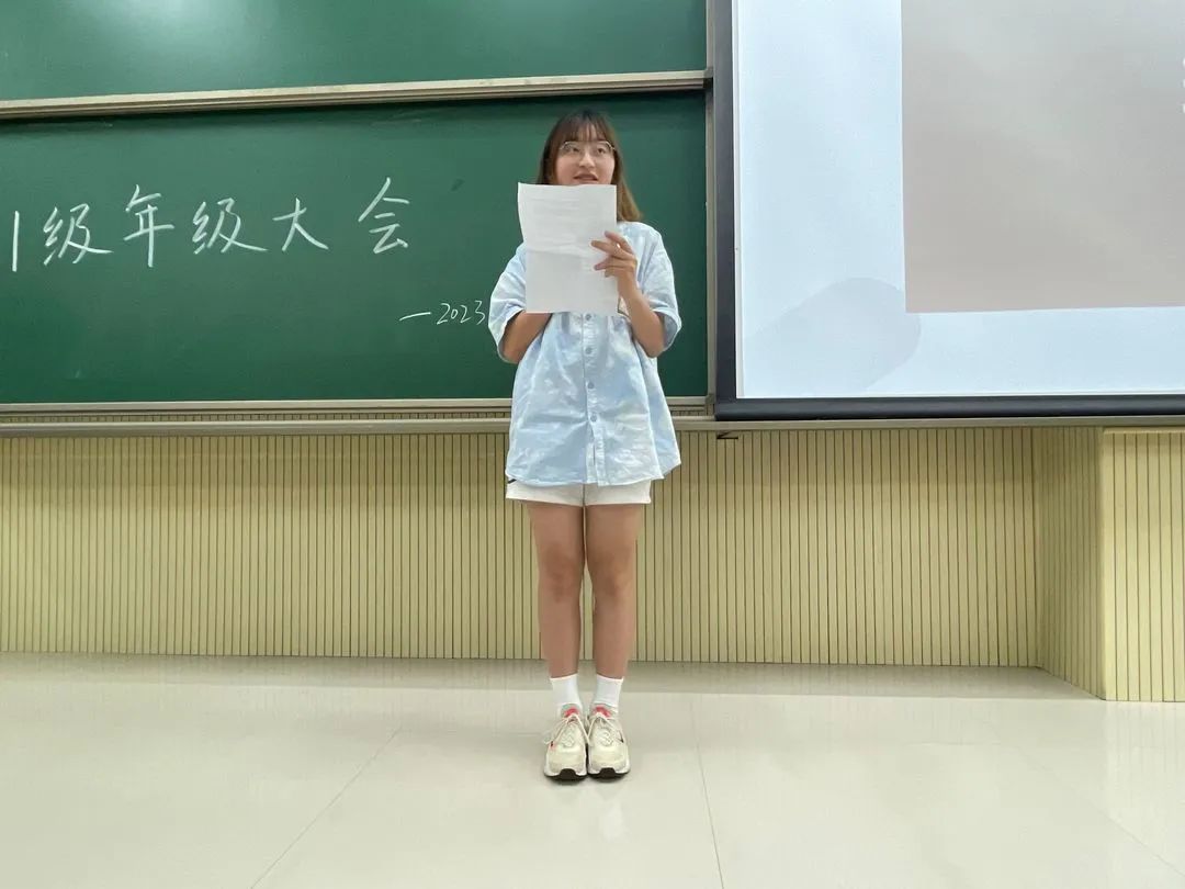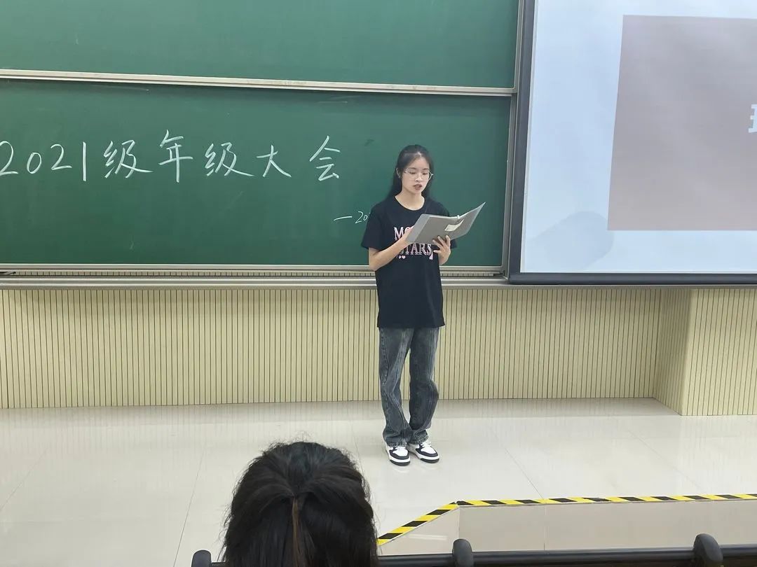 会议第二大部分是学风建设。辅导员对21级四六级通过率及图书馆入馆率进行了通报,并希望同学们以更好的状态迎接接下来的学习,并希望同学们制定目标,提升六级、专四考试通过率。英语201班尹荣悦向同学们分享六级和专四的过级经验。她向同学们介绍了考试的时间分配及各题型的备战技巧,分享了相关学习资源,希望同学们在平时能够及时训练,找出自己的不足,查漏补缺,在考场上能够沉着应对,保持良好的心态。
