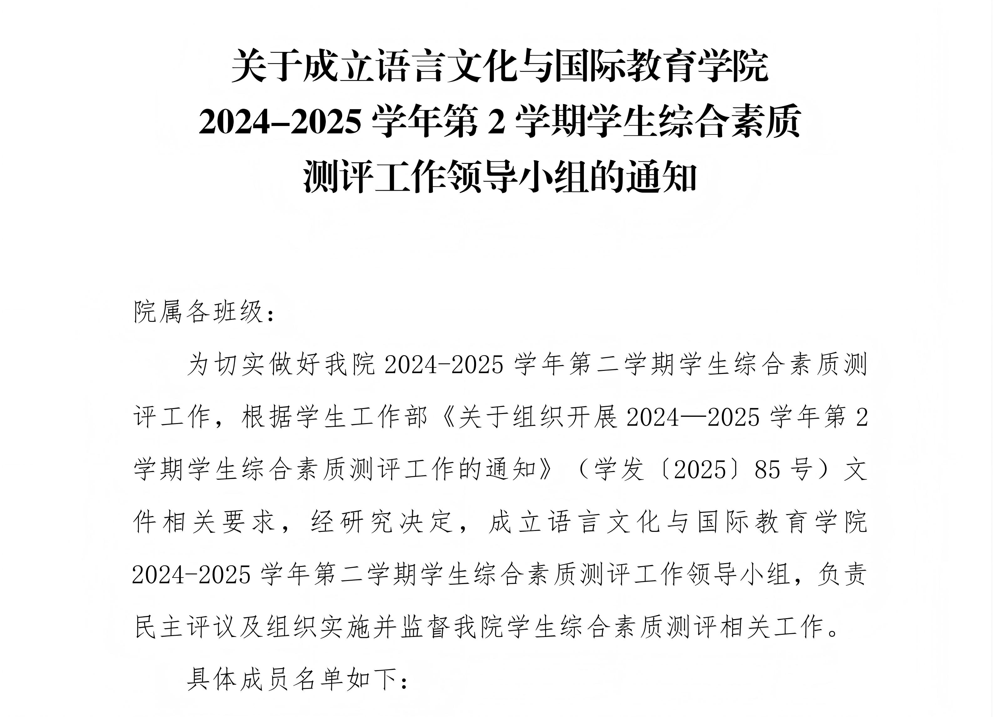 关于成立语言文化与国际教育学院2024-2025学年第2学期学生综合素质测评工作领导小组的通知