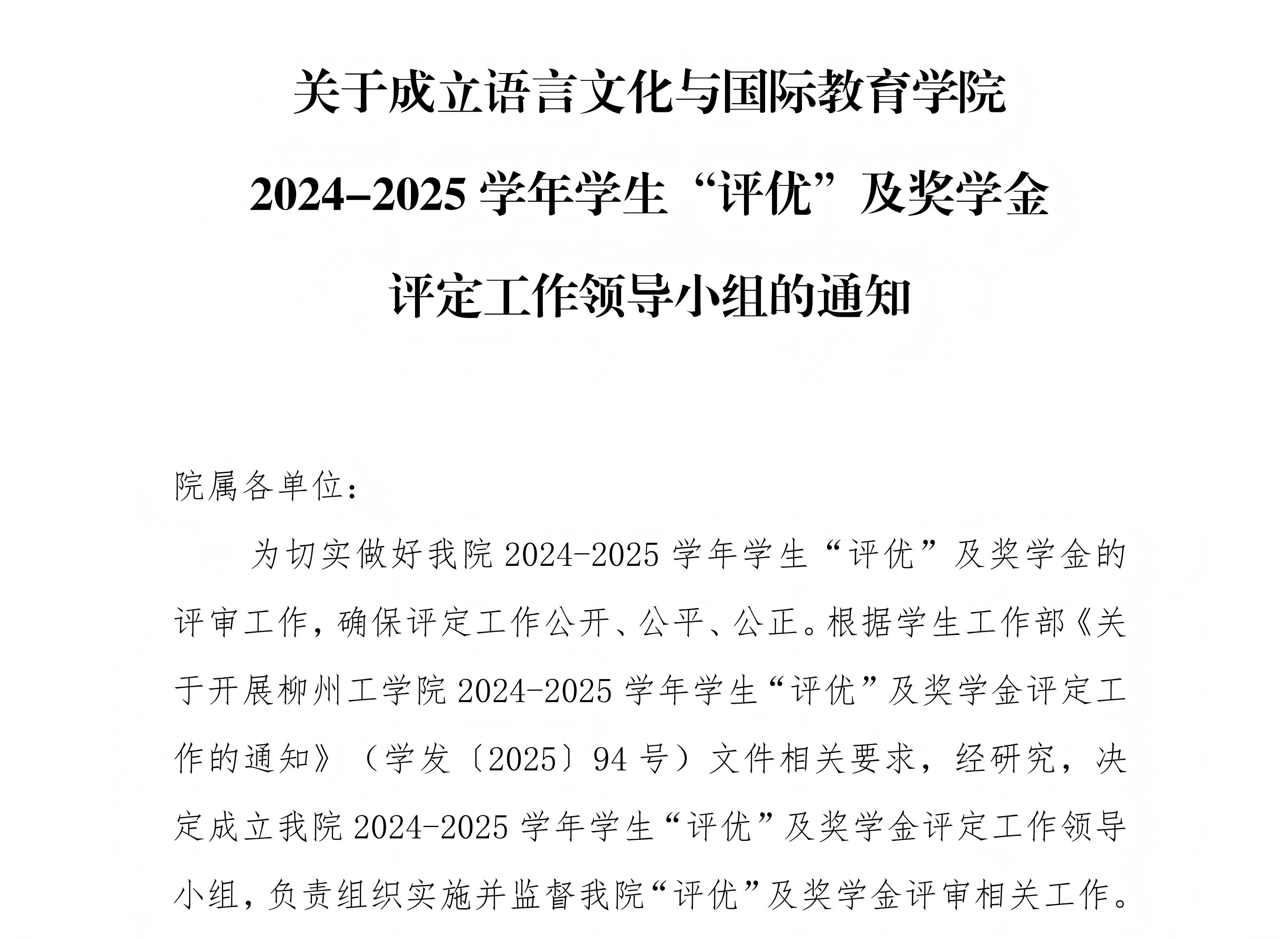 关于成立语言文化与国际教育学院2024-2025学年学生“评优”及奖学金评定工作领导小组的通知