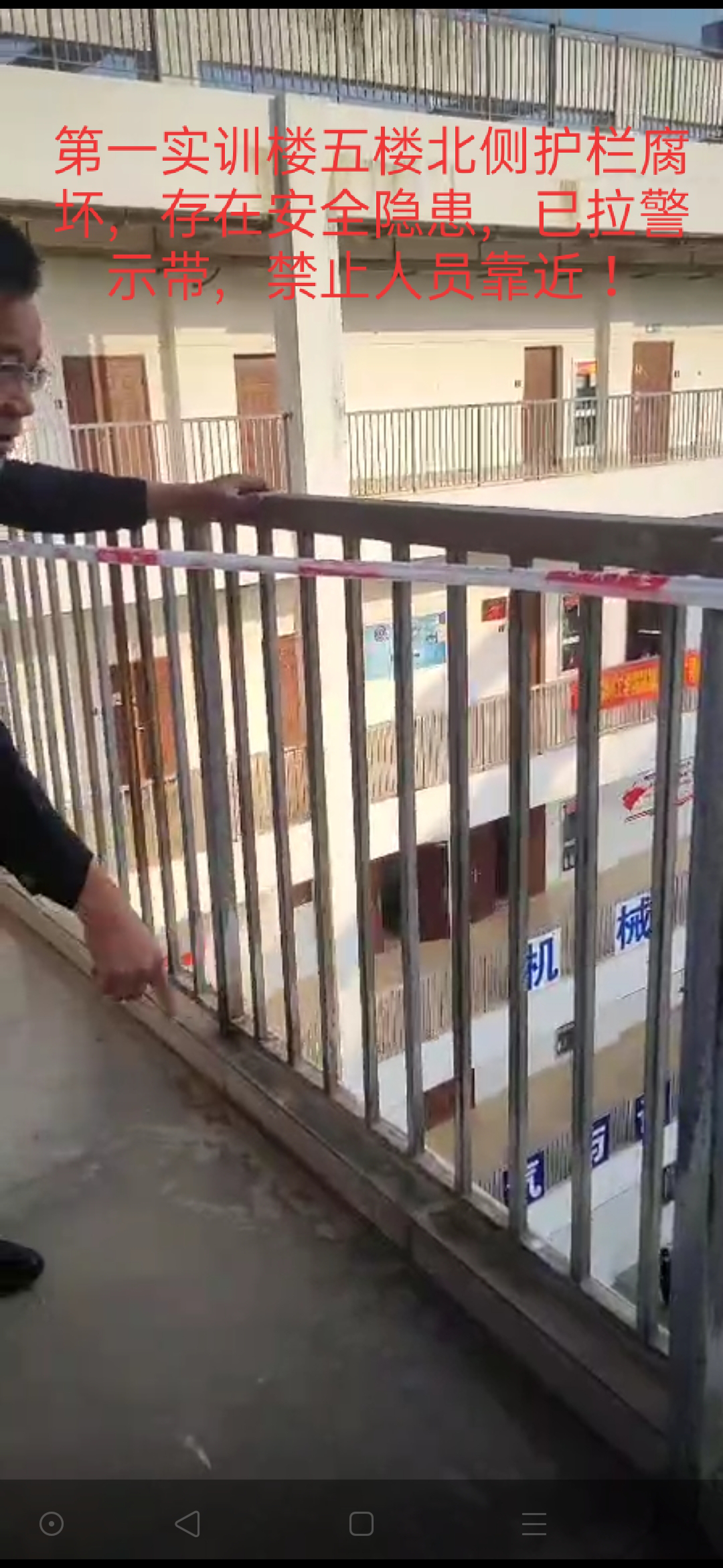 下午16:00我部门巡查校园时发现第一实训楼五楼北侧护栏腐坏,存在安全隐患,已将本情况通报相关部门处理。