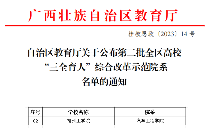 近日,广西壮族自治区教育厅公布第二批全区高校“三全育人”综合改革示范院系名单,我校汽车工程学院榜上有名,获此殊荣。