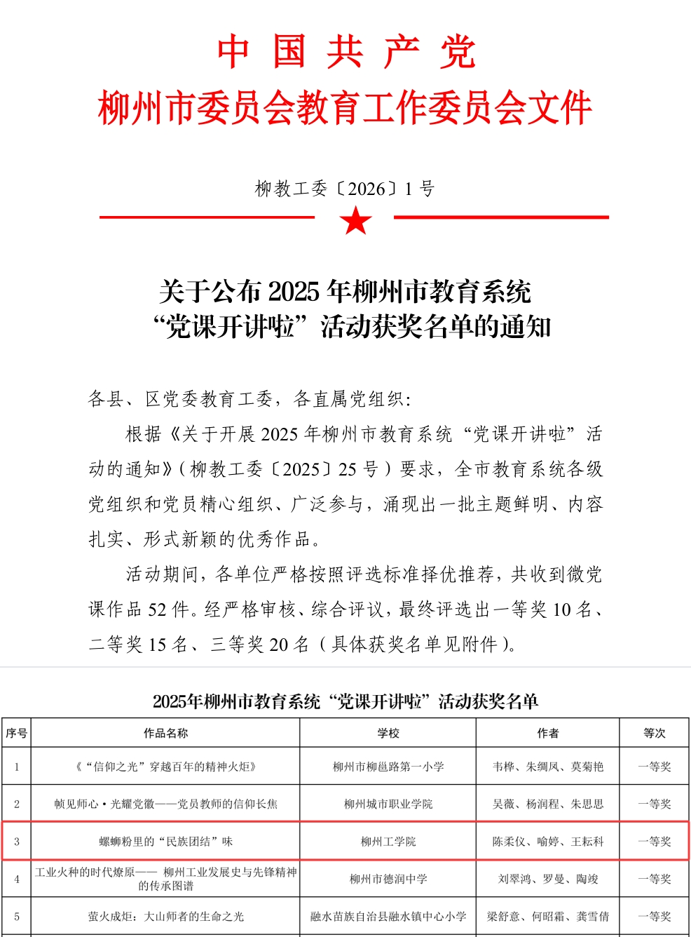 近日,2025年柳州市教育系统“党课开讲啦”活动获奖名单公布,我校马克思主义学院教师团队精心创作的微党课《螺蛳粉里的“民族团结”味》(作者:陈柔仪、喻婷、王耘科)荣获一等奖。