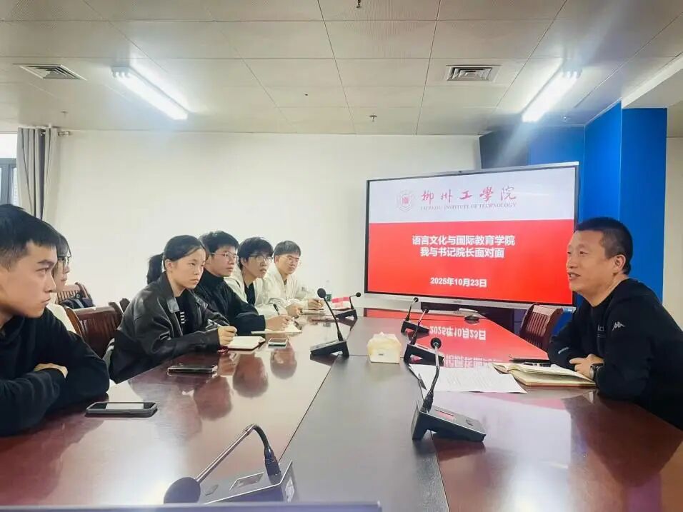 10月23日,语言文化与国际教育学院在科教楼1107会议室举办“我与院长书记面对面”评建建言活动。语教学院院长张胜利、辅导员代表陈崇艳及各班级学生代表参加活动。