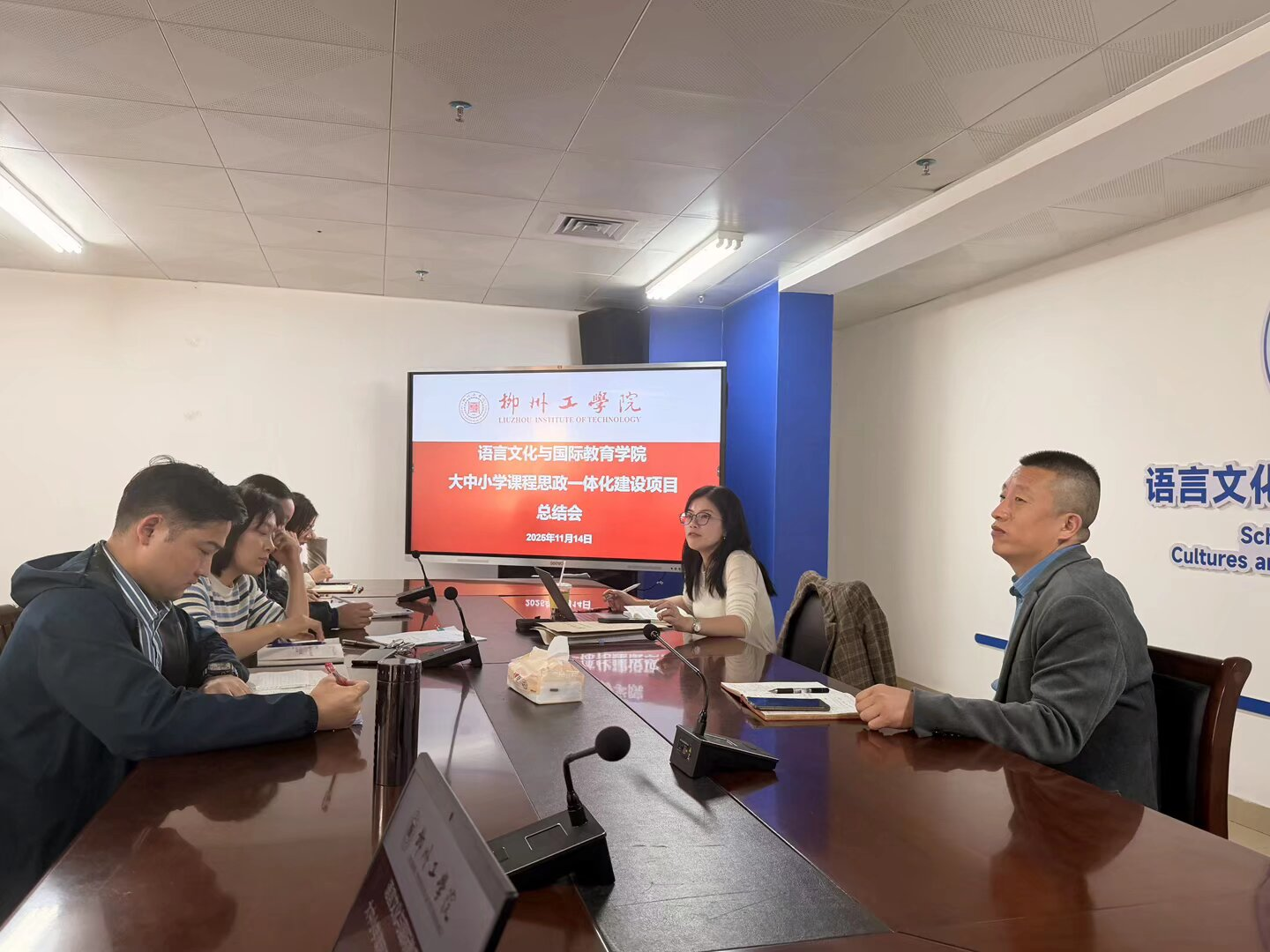 近日,语言文化与国际教育学院英语专业“大中小学课程思政一体化建设项目”顺利举行闭幕仪式暨总结座谈会。语言文化与国际教育学院副院长董月琳、英语教研室教师、2023级英语专业学生及柳州铁一中学校企合作校外导师共同出席本次活动。仪式上,全体与会人员观看了项目总结视频,嘉宾为获奖学生颁发证书,学院领导为校外指导教师授予聘书。在随后的座谈会上,各方代表围绕项目成效与未来发展进行了深入交流。