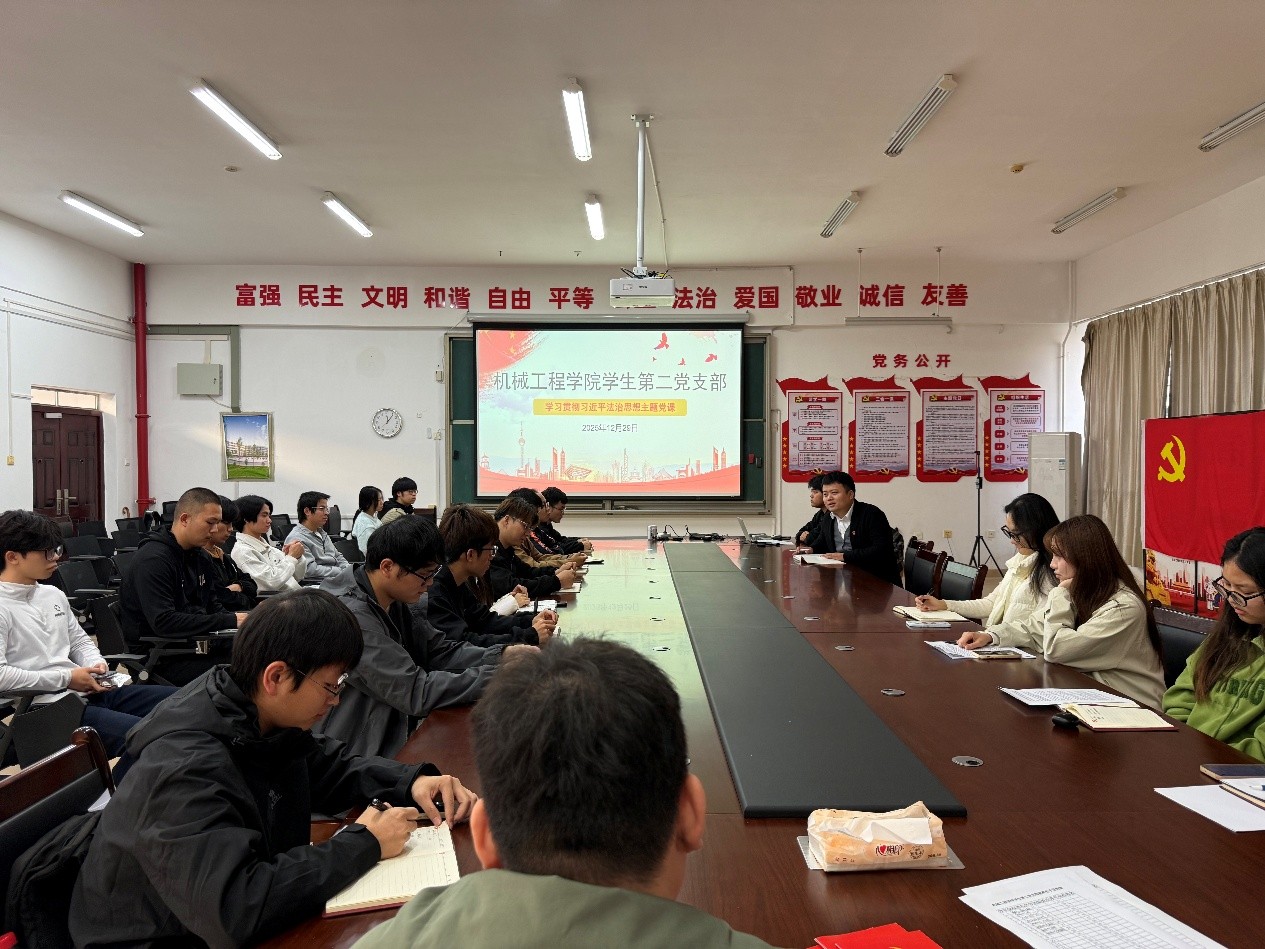 为深入学习贯彻习近平法治思想,切实提升支部党员法治素养与依法履职能力,筑牢新时代工作的法治根基,12月29日,机械工程学院学生第二党支部以“学习贯彻习近平法治思想主题党课”为主题开展专题党课活动。支部书记郭凯授课,全体党员及入党积极分子参加学习。
