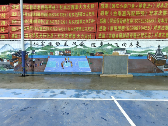 因绘制点位于良开屯篮球场,画面以球场为中心,左侧绘戏台、右侧绘鼓楼,外围点缀居民房、水井、凉亭等景致;球场上,裁判员吹哨抛球、球员起跳抢球的瞬间被生动定格,场外观众喝彩助威的场景跃然墙上;戏台前村民“多耶”欢舞,鼓楼前“百家宴”温情开席;结合滚良屯芦笙文化特色,戏台前还绘有村民吹芦笙的热闹画面。