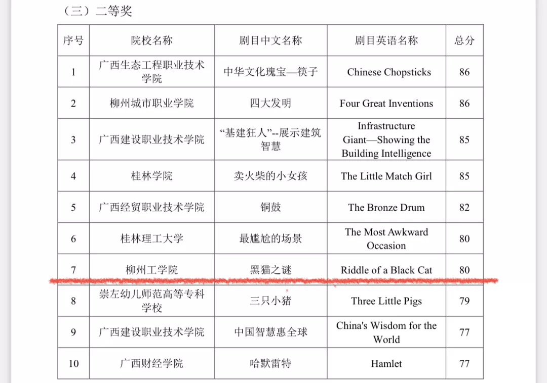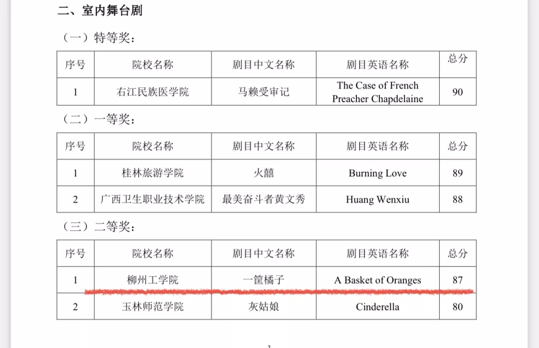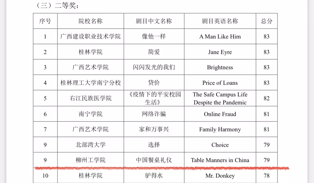 在第十七届广西高校大学生英语戏剧节微电影、室内舞台剧、英文歌曲的比赛中,我校微电影《中国餐桌礼仪》(Table Manners in China)和舞台剧《一筐橘子》(A Basket of Oranges)分别荣获微电影、室内舞台剧类2项二等奖。个人项目讲故事《黑猫之谜》获得1项二等奖;英文歌曲《Closer》《Super Star》分别荣获英文歌曲类1项二等奖、1项三等奖,成绩斐然。