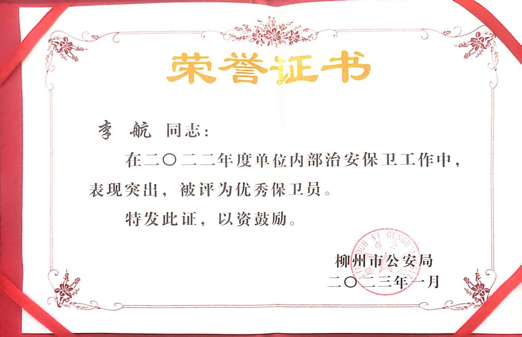 近日,我校荣获“柳州市2022年度治安保卫工作先进保卫机构”称号,学校保卫部李航同志荣获“优秀保卫人员”称号。