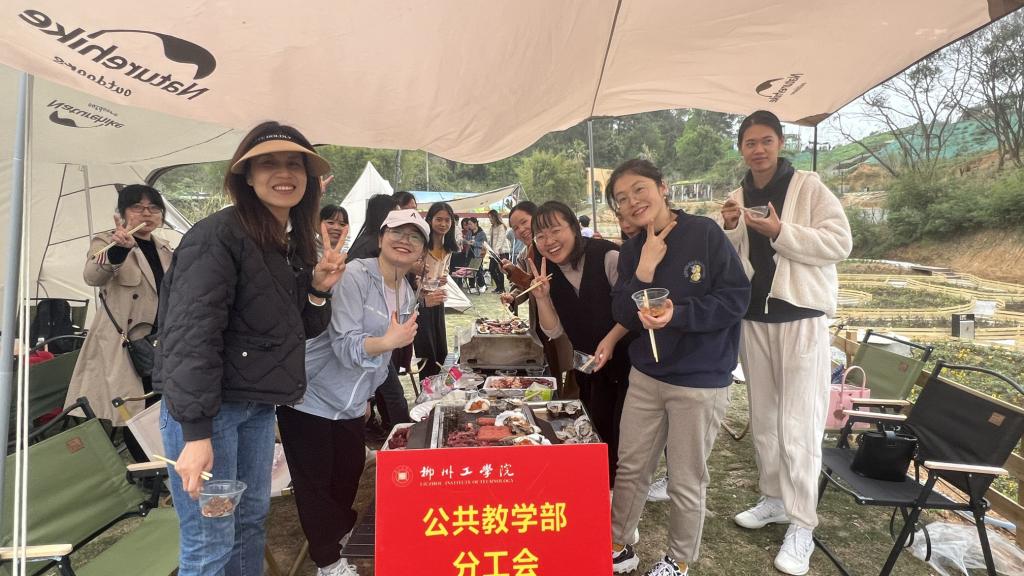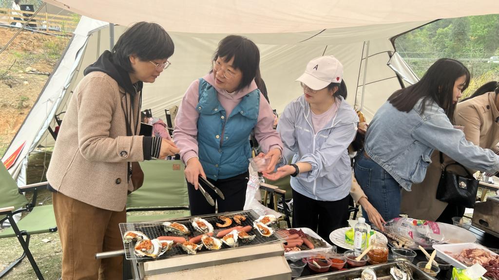 11:30,烧烤活动如火如荼。随着刷子的上下舞动,各种虾、蚝、肉在架子上跳跃着,噼里啪啦的声音在架上炸响,女同胞们动作娴熟地撒上酱料,烤肉的香味从帐篷中弥漫开来,浓浓的情意笼罩在老师们的心中。
