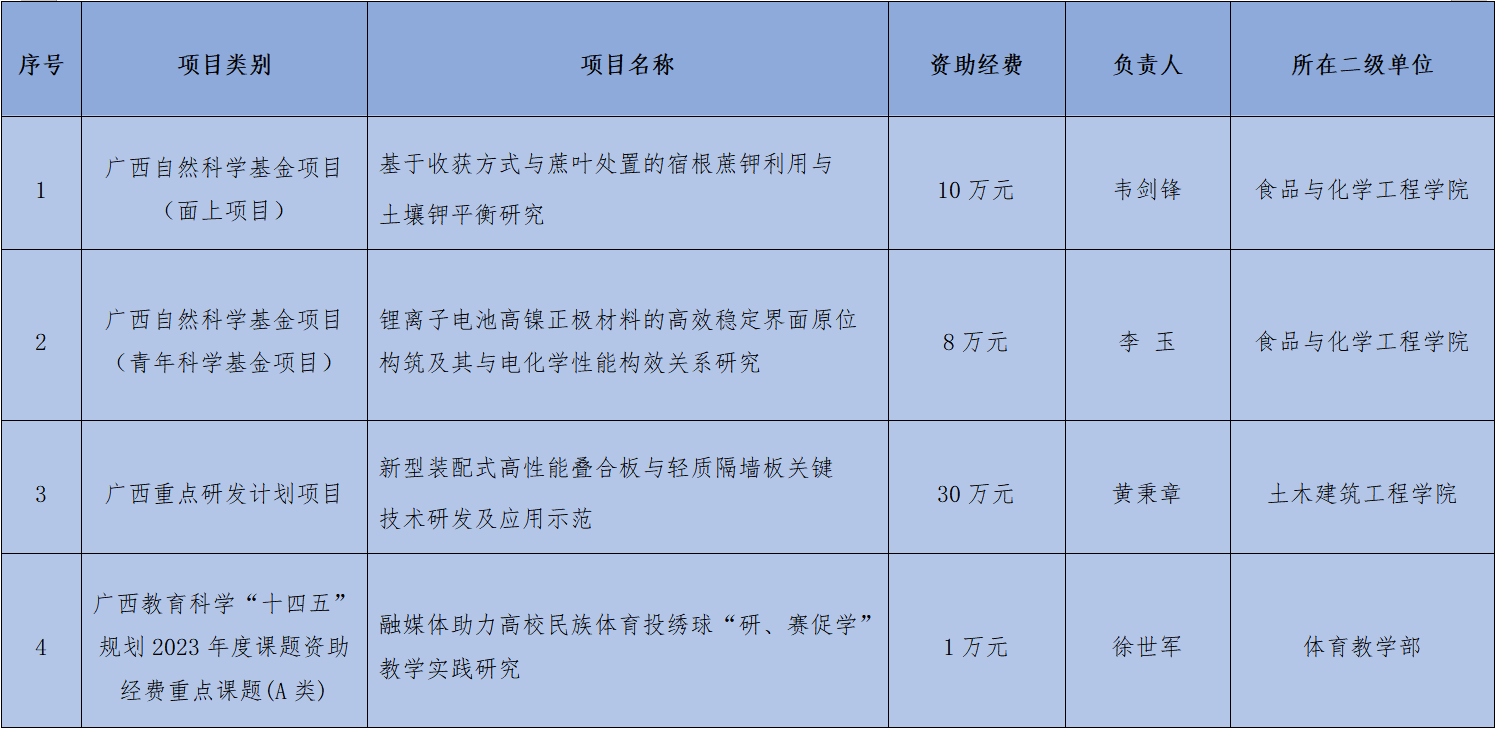 近日,广西壮族自治区科学技术厅、广西教育科学规划领导小组办公室陆续公布了2023年度项目立项结果,我校共获得广西自然科学基金项目2项,广西重点研发计划项目1项,广西教育科学“十四五”规划2023年度课题资助经费重点课题(A类)1项,资助经费共计49万元。