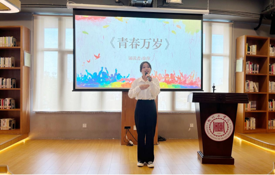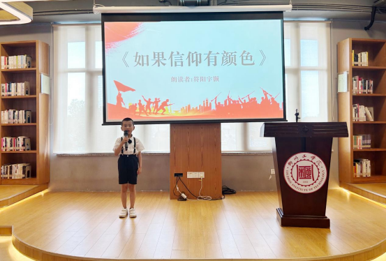 在书香朗读环节,潘艺涵小朋友分享了关于周总理少年励志勤学的故事——《为中华之崛起而读书》,展现了努力拼搏顽强奋斗,使祖国富强的意志和态度。符阳宇颢小朋友朗读的《如果信仰有颜色》,以激情高昂的声音,传达出中国人民团结一致、勇于拼搏、自强不息的精神,体现了中国人民坚定的信念和强烈的责任感。语教学院学生徐萍带来的《青春万岁》,传达了青年人必须有理想、敢奋斗、有目标,需要不断地奋斗,去接住时代发展的接力棒。
