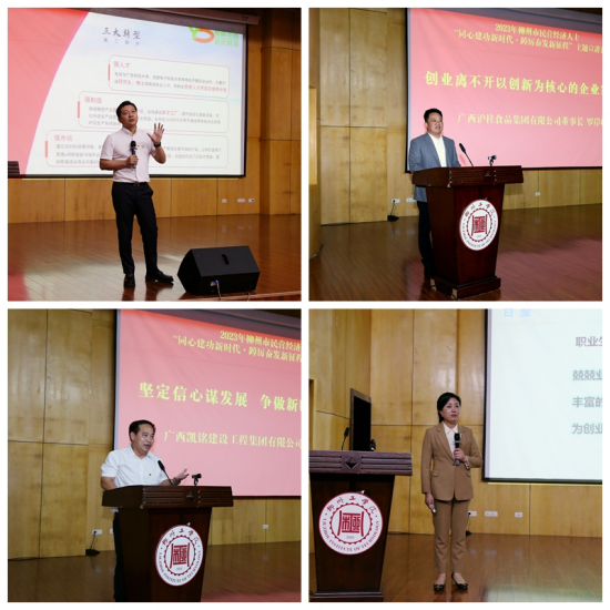 本次活动由市工商联副主席、广西易德科技有限责任公司董事长王光意,市政协委员、市总商会副会长、市民营企业协会会长、市个体私营协会会长、广西沪桂食品集团有限公司董事长罗岸峰,市人大代表、市工商联执委、市郴州商会会长、广西凯铭建设工程集团有限公司董事长李凯,市政协常委、市工商联副主席、市女企业家商会会长、广西白莹科技集团有限公司董事长洪益清4名民营企业家作主题宣讲。他们激情讲述了个人成长和企业发展故事,勇敢追梦、创新发展、爱国敬业主线贯穿始终,并勉励青年学子要坚定理想信念、汲取创新动力,在全面建设社会主义现代化国家新征程中展示青春风采、绽放青春活力、贡献青春力量!
