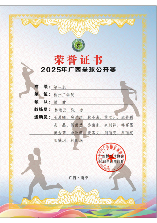 12月14日,由广西棒垒球协会主办,广西机电职业技术学院与柳州市棒垒球协会联合承办的2025年广西垒球公开赛圆满落幕。我校棒球队经过多轮激烈角逐,最终凭借稳定的发挥荣获季军,为学校赢得了荣誉。