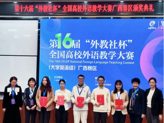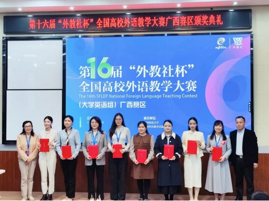 近日,在第十六届“外教社杯”全国高校外语教学大赛(大学英语组)广西赛区比赛中,我校教师再创佳绩。语言文化与国际教育学院专任教师柯青新、吴晨阳分别荣获综合课组一等奖和视听说课组二等奖,充分展现了我校青年教师扎实的专业素养与出色的教学水平。“外教社杯”全国高校外语教学大赛是我国外语界规模最大、最具影响力的专项赛事之一。本届广西赛区比赛由上海外国语大学主办,广西师范大学与上海外语教育出版社联合承办,设综合课组与视听说课组两个组别。在综合课组比赛中,柯青新发挥出色,以优异表现成功晋级决赛。决赛中,她凭借严谨的教学设计、深入的教材解读与流畅的现场应答,赢得评委一致好评,最终荣获一等奖。