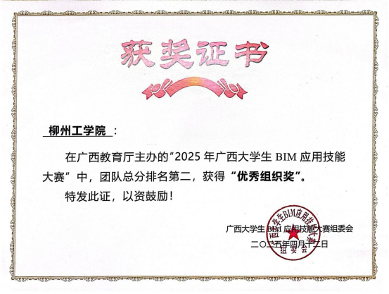 近日,2025年广西大学生BIM应用技能大赛结果公布。柳州工学院6支参赛队伍凭借扎实的专业知识与出色的团队协作,共获一等奖4项、二等奖1项、三等奖1项,柳州工学院荣获优秀组织奖。