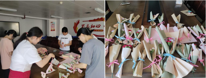 包装好精美花束后,志愿者们手捧精心准备的康乃馨,满怀敬意地向老师们献上鲜花,感谢她们如同母亲般给予我们支持,在学习和生活上给予我们关心与帮助。老师们收到鲜花后脸上洋溢着幸福的笑容,现场充满着温馨的氛围。