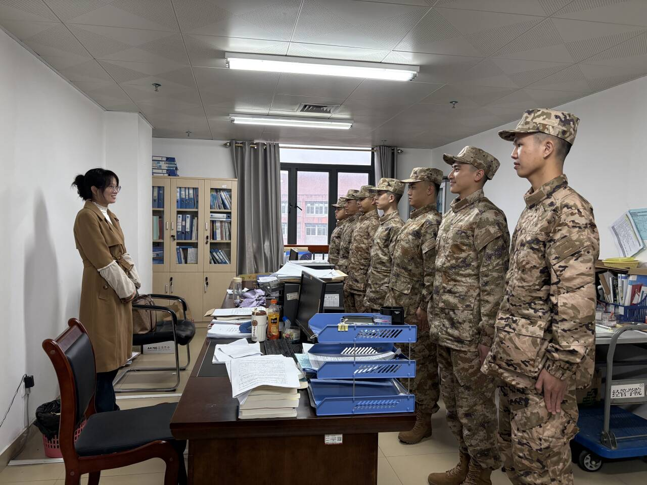 会议结束后,应征入伍学子前往学院各办公室,向老师们表达感恩之情。教师代表纷纷向同学们表示祝贺,并送上殷切嘱托,希望他们在军营中刻苦锻炼、增长才干,以优异的表现为祖国增光添彩。