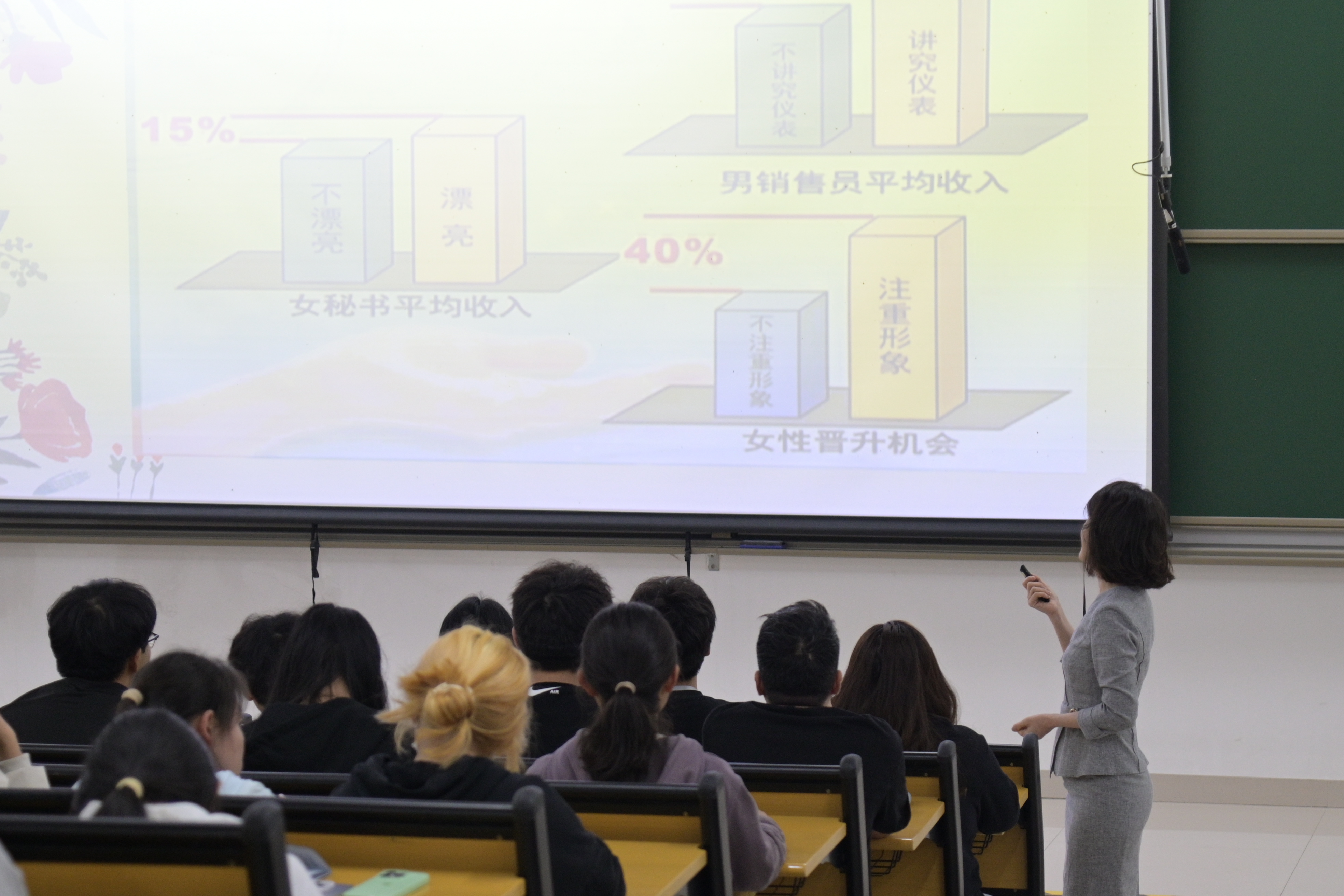 在形象礼仪板块,林筠老师系统讲解了塑造良好形象的要点。她指出,形象是个人的无声名片,融合了自然美、修饰美与内在美,传递着丰富的信息。在仪容方面,男士应保持面部整洁清爽,展现干练风貌;女士宜适度化妆,增添自信与亲和力,同时,保持头发、指甲的洁净是基本要求,长发束起更显精神。