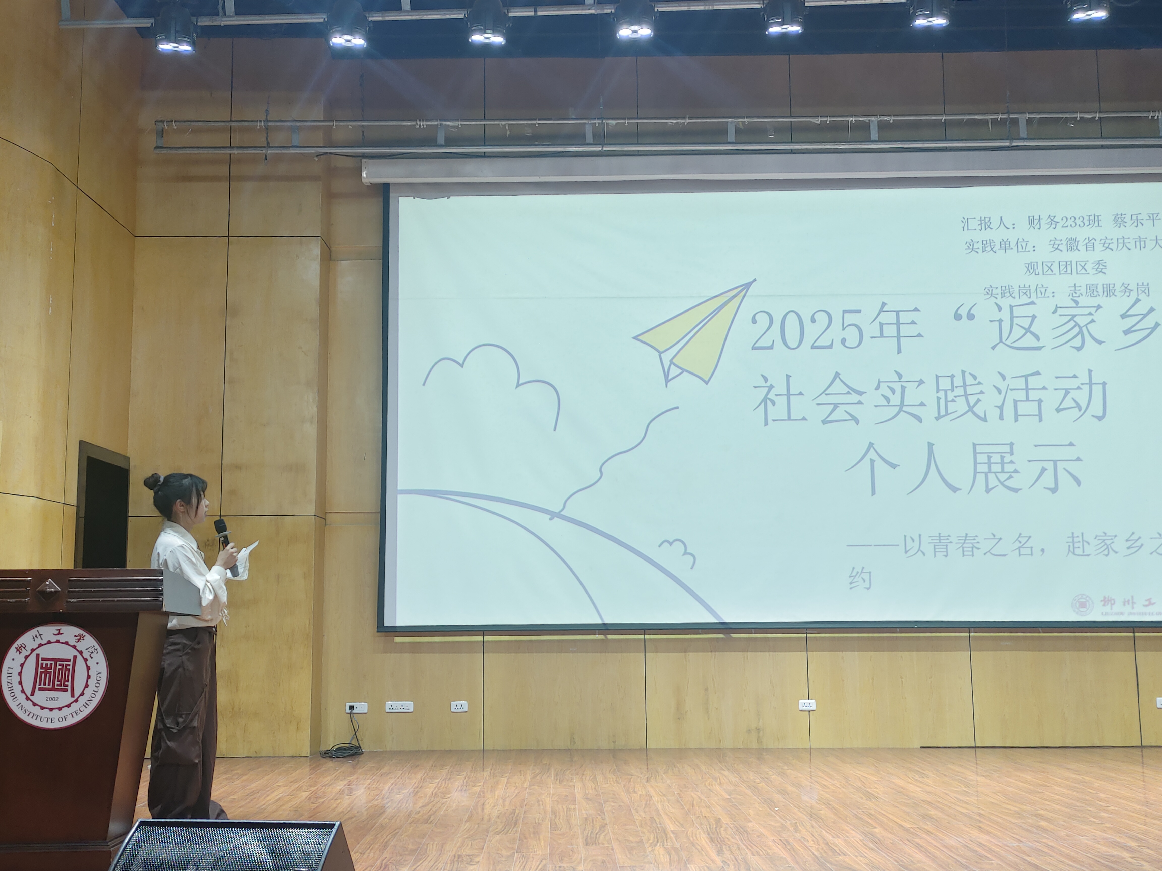 分享环节,6位学生代表依次登台,讲述了自己的实践经历。他们中有人参与社区志愿服务,关爱孤寡老人、整治社区环境;有人投身家乡文化宣传,通过新媒体展示家乡独特魅力;还有人运用专业知识助力小微企业发展。这些实践虽看似平凡,却精准对接了家乡需求,生动体现了青年学子扎根基层、服务家乡的决心。