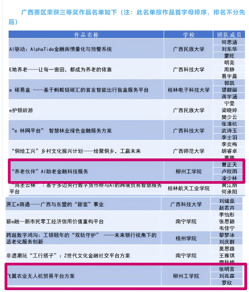 本次比赛由经济管理学院陈婉霞、李卓、王玲玲、韦艳秋四位老师共同指导,金融231班张明言、曹正天两位同学分别担任队长的两支学生团队(成员包括金融231班刘兆森、金融241班罗欣、财务231班卢欣雨、标准化231班凌少林),在广西赛区激烈角逐中脱颖而出,双双荣获三等奖。