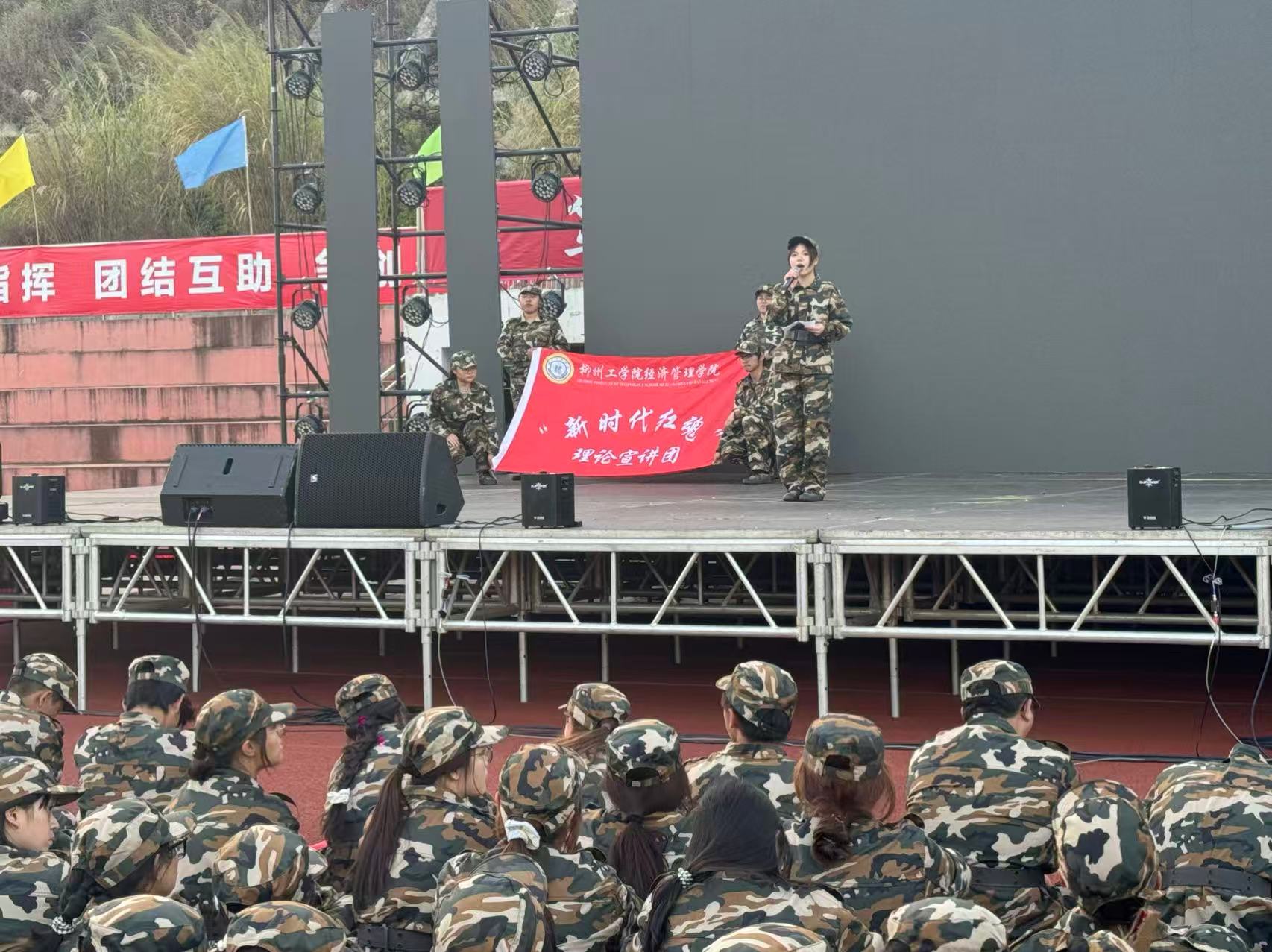 随后,石彬同学以“军训与国防的青春交融”为主题进行宣讲。她结合党的二十届四中全会关于“十五五”规划中推进国防和军队现代化、统筹发展与安全等重要部署,将“新质生产力”等理念与军训过程中所体现的协作精神、创新意识相结合,号召同学们在迷彩青春的历练中坚定理想信念,以实际行动投身中国式现代化建设的伟大征程。