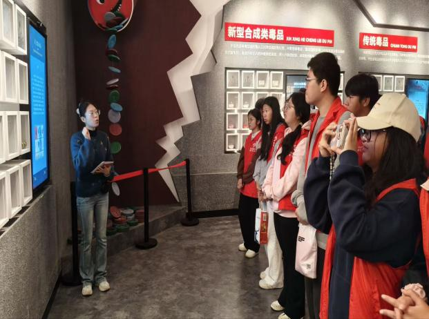 在基地讲解员的引导下,同学们依次参观了传统毒品展示区、新型合成类毒品展区以及柳州禁毒工作成果展示墙。展区内陈列的鸦片、海洛因等传统毒品仿真样本,与伪装成奶茶、巧克力、电子烟油的新型毒品模型形成鲜明对比,帮助大家直观辨识毒品的多样形态与隐蔽性。讲解员结合真实涉毒案例,深入剖析了各类毒品的成瘾机制与社会危害,并围绕柳州作为边境地区严防境外毒品渗透的工作重点,介绍了本地禁毒执法的典型案例与显著成效。