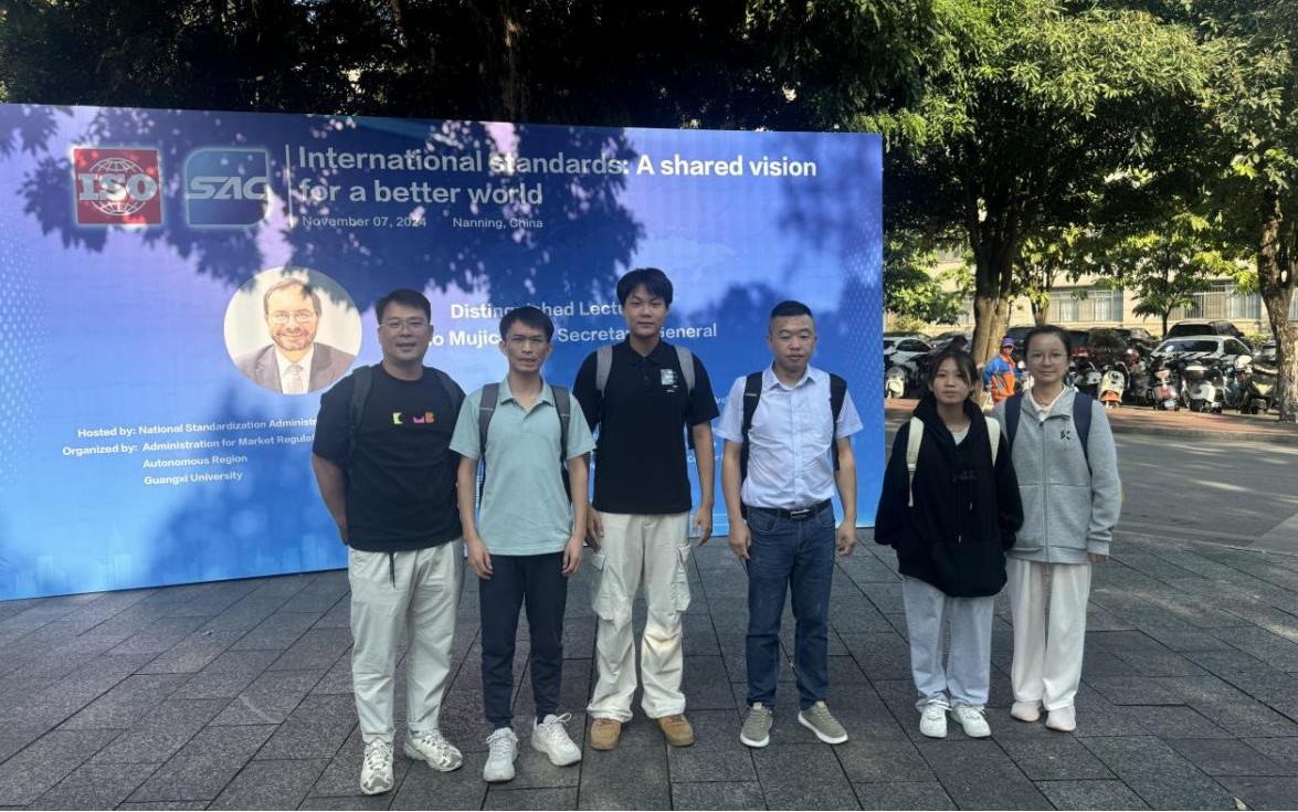 为进一步加强国际标准化工作交流与学习,完善标准化人才培养工作体系。2024年11月7日,教研室主任张啟朗、副主任肖文俊,专任教师李洪华,以及土木建筑工程学院专任教师韦峻峰带领标准化工程23级学生凌少林、陈静一同前往广西大学参加“国际标准促进可持续发展”主题活动。