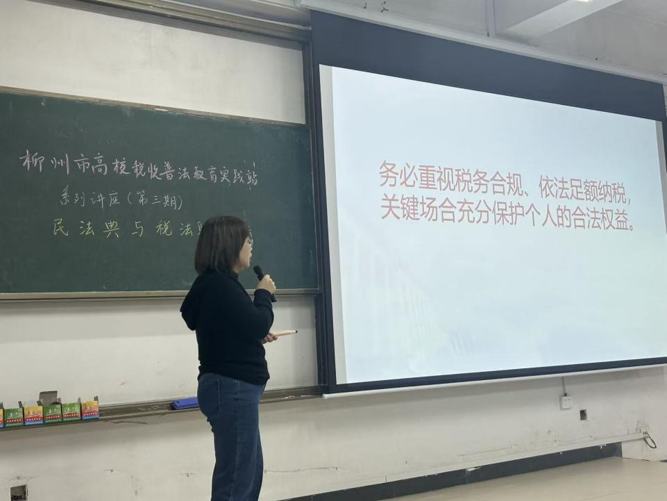 2025年12月17日下午,柳州工学院经济管理学院财务管理专业与国家税务局柳州市税务局联合开展的税收普法教育实践站系列讲座第三期在我校顺利举行。本次讲座特邀具备律师与税务师双重执业资格的徐燕老师,以“民法典与税法联动普法”为主题,为财务管理专业学生带来一场融合理论与实务的跨界课堂。