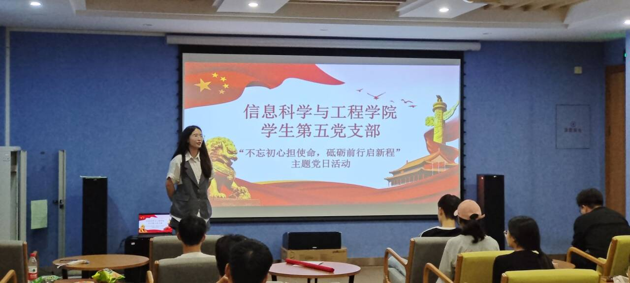 为进一步加强毕业生党员对身份的认同感、使命感和责任感,引导他们在新的征程上继续发挥先锋模范作用,共话未来,2024年6月22日信息科学与工程学院学生第五党支部在图书馆B区三楼音乐影视厅召开“不忘初心担使命,砥砺前行启新程”主题党日活动。本次活动由党支部书记黄慧欣老师主持,党支部全体党员和积极分子共同参加。