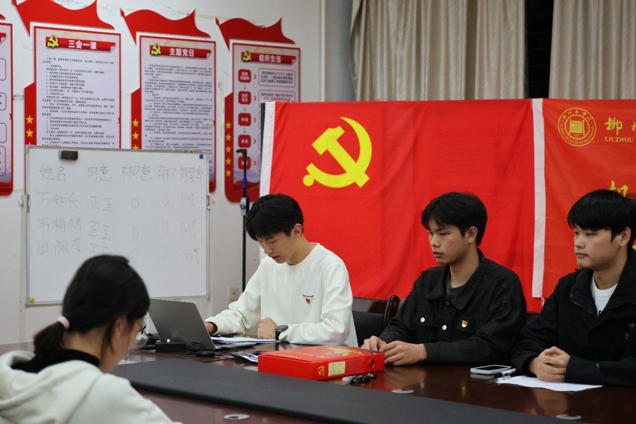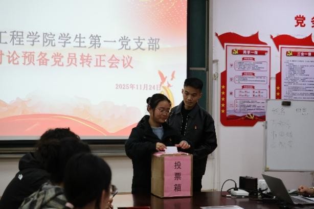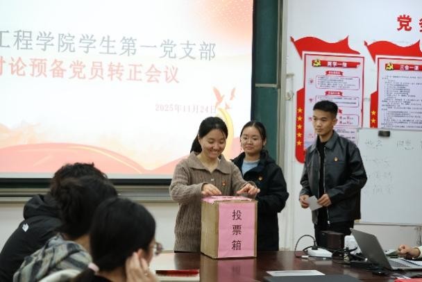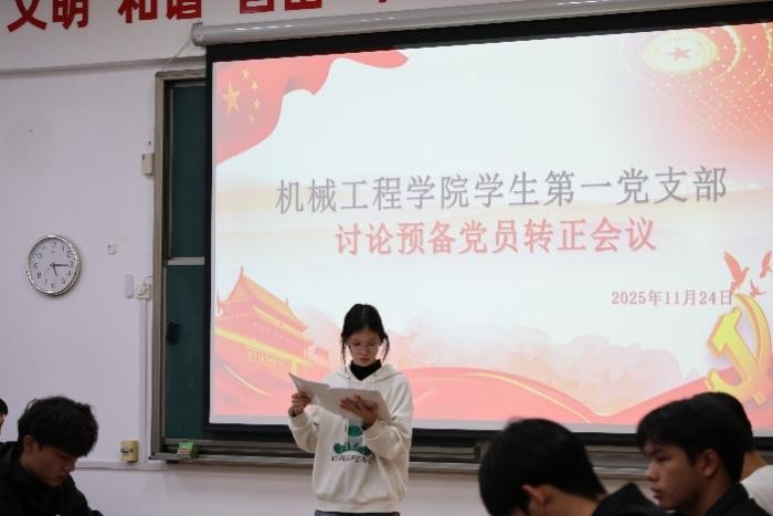2025年11月24日,机械工程学院学生第一党支部在党员活动室召开预备党员转正会议,讨论万如乐等3名同志预备党员的转正问题。参会人员有机械工程学院学生第一党支部书记张金凤以及全体学生党员。本次会议由彭健同志主持。