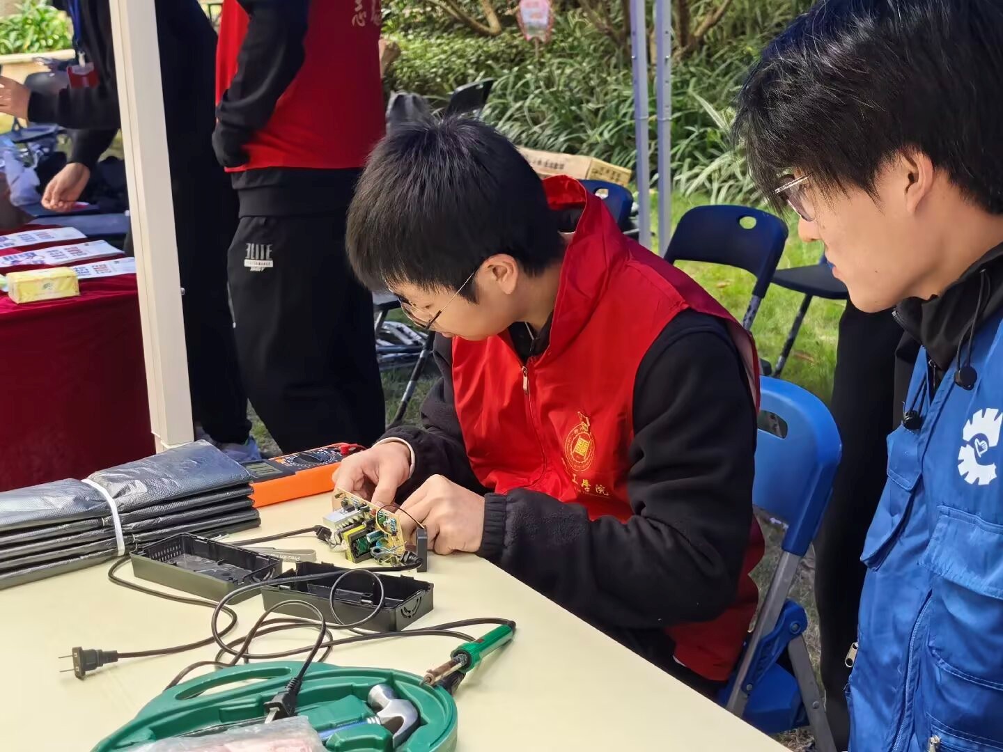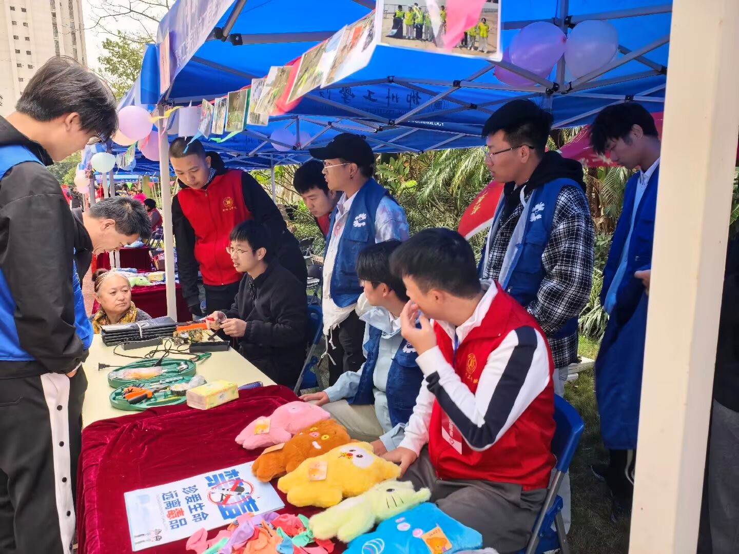 在众多服务项目中,机械工程学院青年志愿者协会的“蓝扳手”志愿服务队和禁毒宣传展台尤为引人注目。“蓝扳手”的同学们运用所学工科知识,为居民们检修小家电、解答技术问题,那灵巧的双手和专注的神情,正是知识服务社会的最佳注解。同时,志愿者们还向来到“蓝扳手”摊位前的居民普及毒品知识。他们通过清晰明了的讲解和生动鲜活的案例,将“珍爱生命,远离毒品”的理念深植于社区居民的心中。