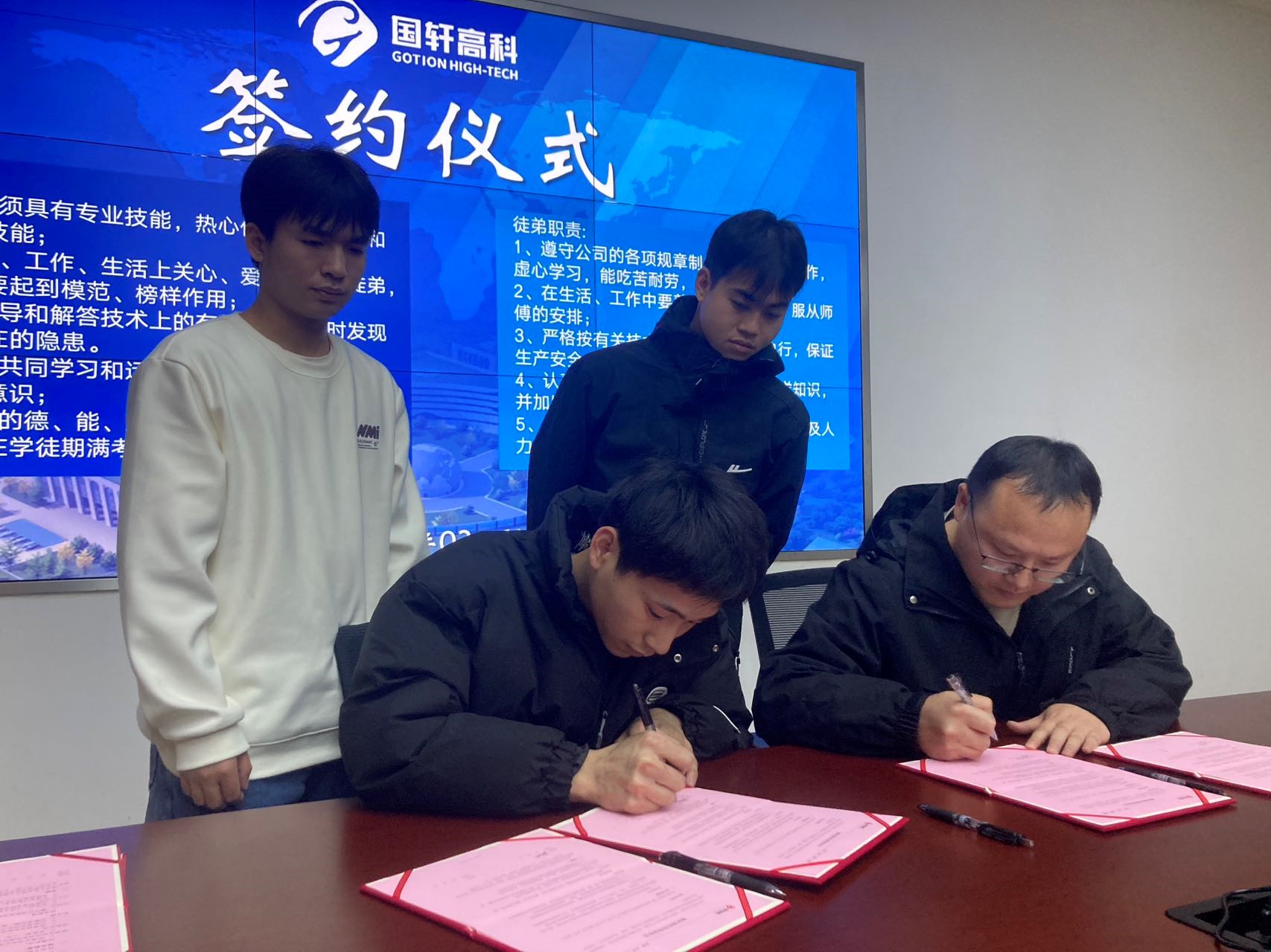 本次培训采用“企业导师+生活导师”的二对一导师制,在庄重的签约仪式上,双方代表于协议上工整署名,导师执笔时沉稳收锋,学员双手接笔后郑重落款,双方就技术传承与技能提升达成共识。此刻,期盼导师以匠心倾囊相授,学员以热忱虚心求教,在繁忙产线中淬炼真知,于精密仪器间传承技艺,为柳州国轩注入生生不息的创新动能。