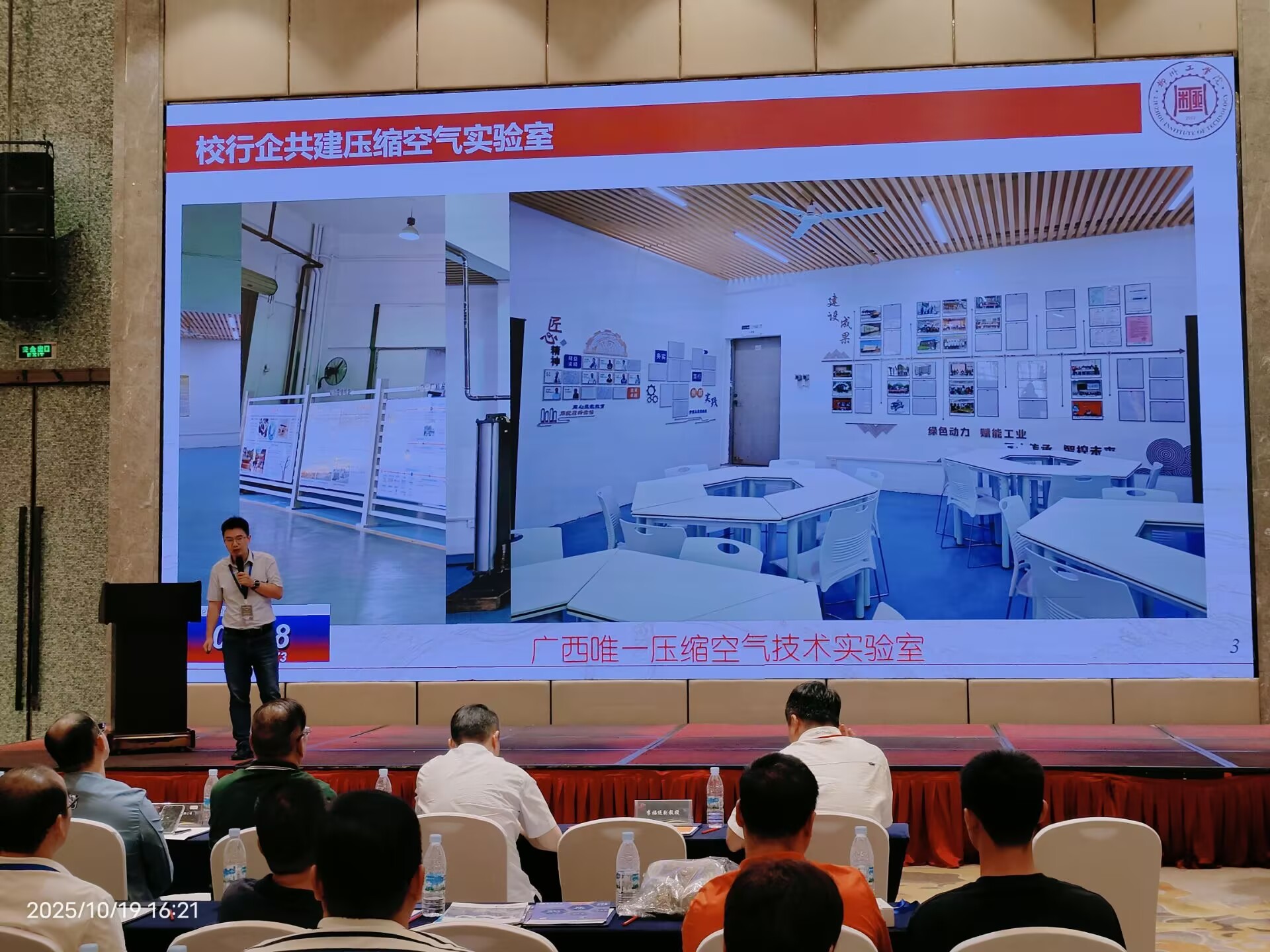 在大会主题报告环节,机械工程学院李福送老师受邀做专题汇报——聚焦压缩空气:校行企协同育匠才。李老师向压缩空气厂商及相关企业详细介绍了我院在压缩空气技术领域的人才培养成果,包括压缩空气技术与应用研修班的历届举办情况、压缩空气技术实验室的建设历程、合作企业规模、已取得的显著成效以及未来的发展规划。汇报充分展示了柳州工学院在应用型人才培养和产教深度融合方面的探索与实践,获得了在场企业代表的高度评价和热烈反响。