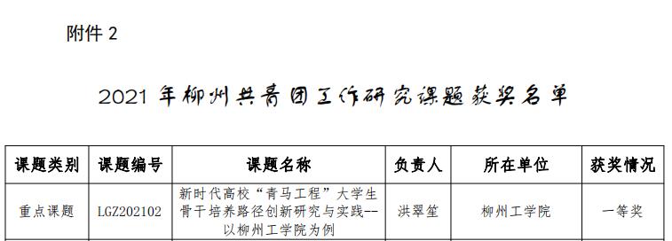近日,共青团柳州市委员会公布 2021年柳州共青团工作研究课题评审结果,经评审专家组审议,共青团柳州市委员会批准,我校5位老师申报的2021年柳州共青团工作研究课题均顺利通过结题,其中1项获得优秀,4项获得合格。其中,洪翠笙老师的《新时代高校“青马工程”大学生骨干培养路径创新研究与实践--以柳州工学院为例》荣获一等奖。