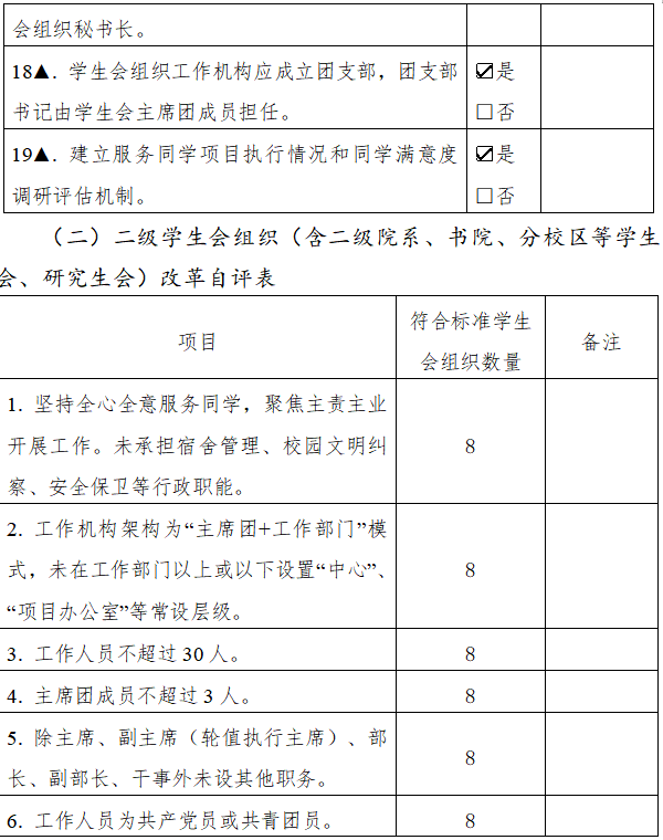 为落实共青团中央、教育部、全国学联联合下发的《关于推动高校学生会(研究生会)深化改革的若干意见》,并结合《关于巩固高校学生会(研究生会)改革成果的若干措施》文件要求,接受广大师生监督,现将我校2021—2022学年学生会(研究生会)改革情况公开如下。