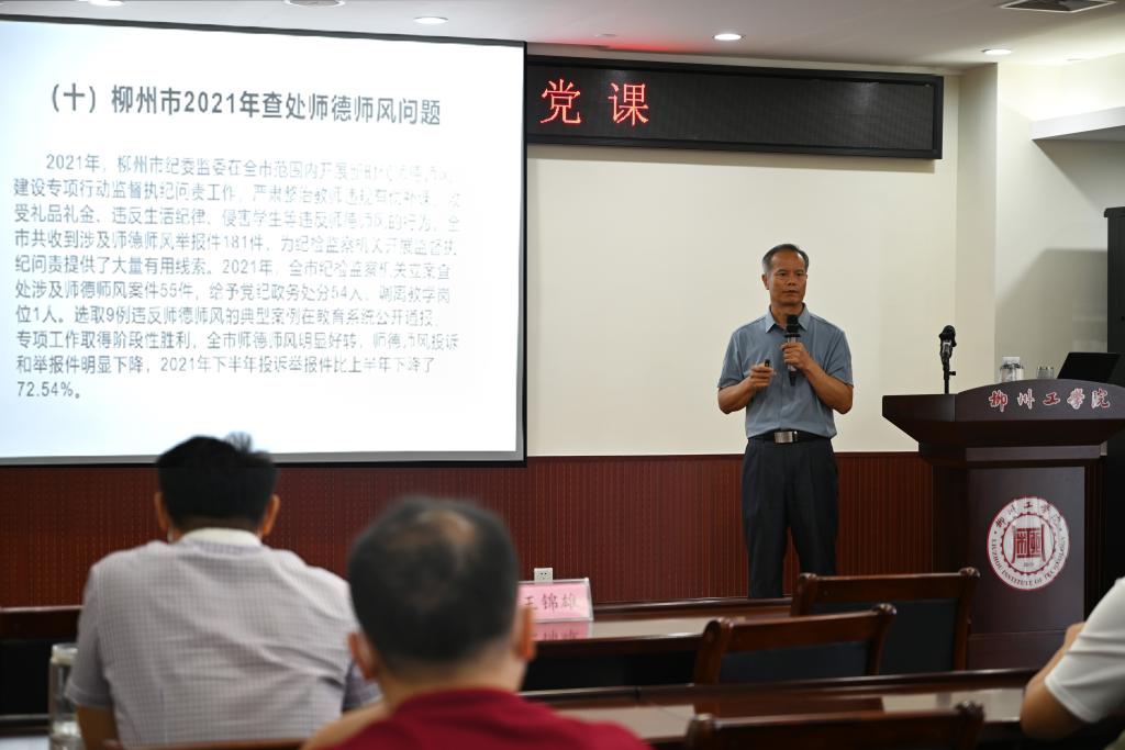 为进一步贯彻落实党的教育方针,打造一支师德高尚、业务精湛的高素质教师队伍,9月23日下午,我校纪委书记王锦雄受邀在18楼多功能会议室为马克思主义学院党支部、汽车工程学院党总支、机关第三党支部全体党员上了一堂“强化师德师风建设 争做‘四有’好教师”的专题党课,陆丽霞同志主持了本次学习。