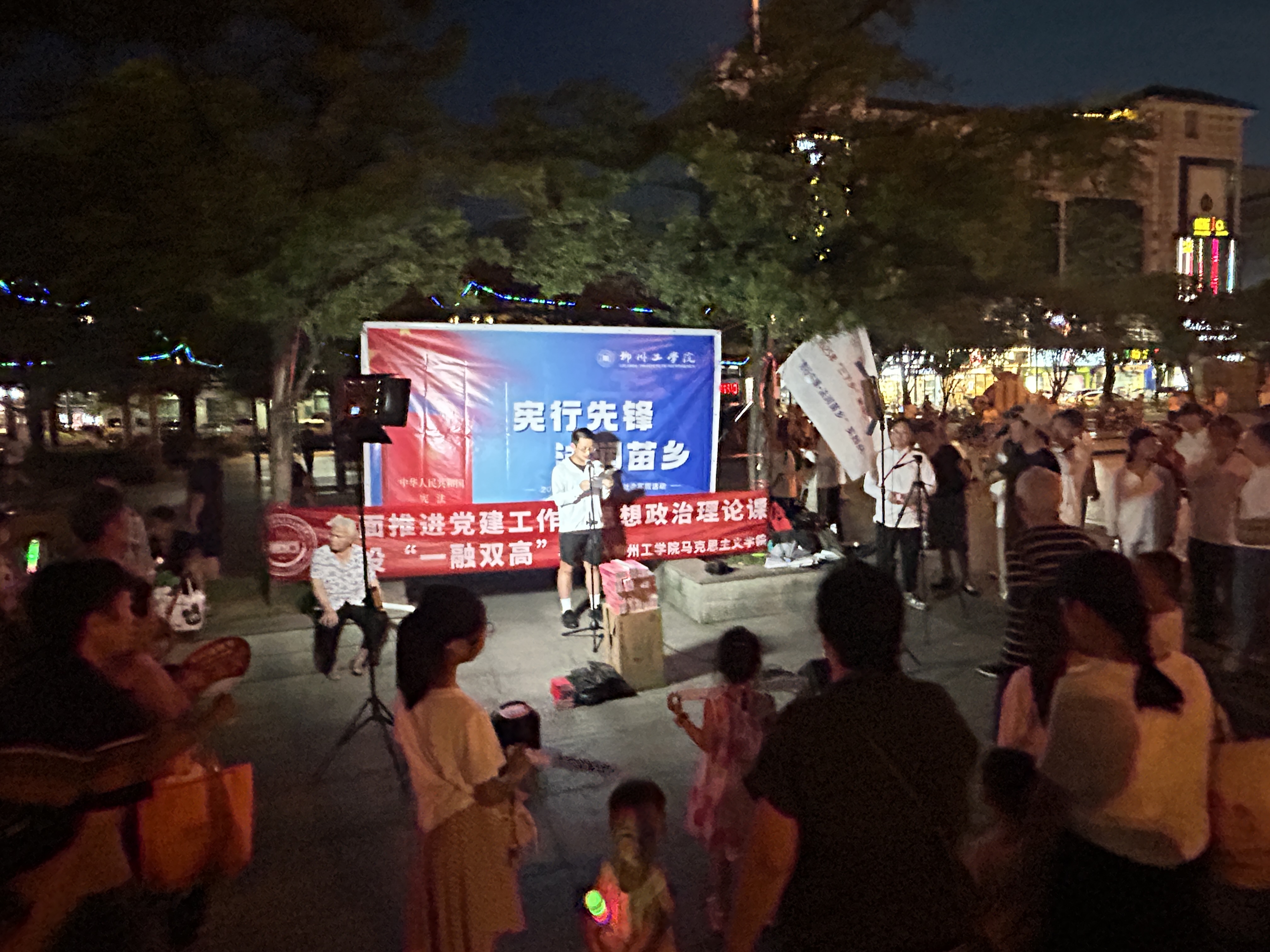 在融水县城广场,吕晓燕老师指导学生开展“宪法先锋、法润苗乡”主题宪法宣讲活动。面对聚拢而来的居民,普法主讲学生,用当地群众听得懂的方言进行普法,瞬间拉进了与乡亲们的距离。在宪法有奖知识问答中,现场气氛热烈,男女老少踊跃抢答,法律知识在欢乐氛围中深入人心。“抢答题目不仅能增加法律知识,还有奖品可以拿,真是太好了!”一位小朋友激动的说。师生合力将严肃的法治知识转化为温暖可感的普法实践,展现新时代法治宣传的温度与力量。