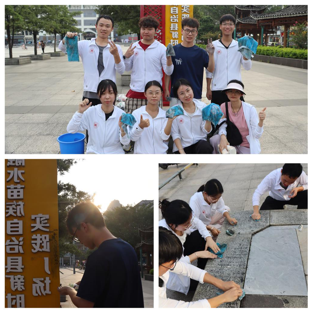 在广场普法的活动中,吕晓燕老师与实践队员们发现广场的设施中有多处不文明标语。师生自发擦洗广场及周边老旧、不文明标语痕迹。举手之劳传递了基层治理的文明新风,‘擦亮’之举,擦去的是旧痕,点亮的是广大青年心中服务社会的责任与担当。