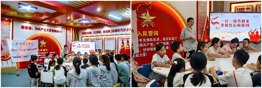 7月21日,覃帅老师带领实践团走进融水县青少年校外活动中心,为当地小学生主讲《一针一线共缝家,各族红心向祖国》专题党课。融水作为兼具民族特色与红色基因的地区,文化底蕴深厚、革命传统光荣。课堂上,覃帅以融水历史为脉络,串联红色记忆与非遗文化。他讲述了当地少数民族群众在革命时期拥护和支持红七军的红色故事。同时,他细致讲解了少数民族纹样中蕴含的团结、勇敢等精神内涵,比如蝴蝶纹象征着生命的延续与族群的凝聚,铜鼓纹承载着对美好生活的向往,这些纹样与红色故事里的精神相互呼应,让孩子们明白非遗文化不仅是技艺的传承,更是精神的延续。实践团学生在指导老师带领下配合开展互动,他们特地从柳州义捐小玩偶作为问答奖励,激发少先队员抢答热情;还展示民族特色纹样、分享簇绒手作故事,与小朋友们共悟民族团结与爱国情怀。课后,覃帅寄语孩子们以此次学习为契机,争做爱党爱国、自立自强、奋发向上的新时代好少年,让红色基因与民族文化代代相传。
