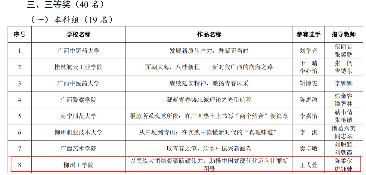 近日,由自治区党委教育工委、自治区教育厅主办的全区高校大学生党的创新理论宣讲大赛获奖名单正式公布。由我院陈柔仪老师主要指导,土木建筑工程学院建筑学241班王弋萱同学主讲的宣讲作品,凭借扎实的理论功底、生动的宣讲表现和深刻的思想内涵,在众多优秀作品中脱颖而出,荣获大赛三等奖。此次获奖,不仅是我院学子风采的精彩展现,也是我院在深化党的创新理论“三进”工作、创新思政育人模式上取得的又一可喜成果。