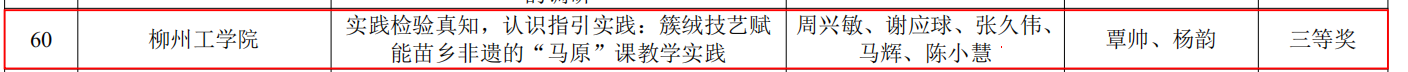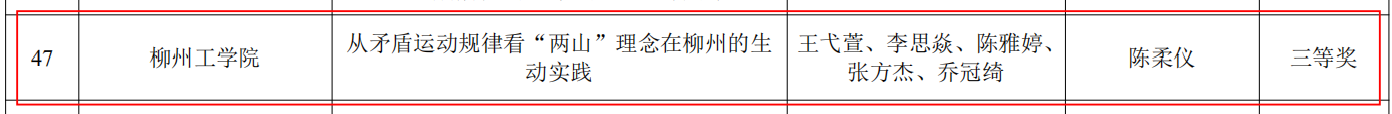 王弋萱、李思焱、陈雅婷、张方杰、乔冠绮团队完成的《从矛盾运动规律看“两山”理念在在柳州的生动实践》(指导教师:陈柔仪)荣获本科组三等奖。该作品通过调研柳州市生态文明建设的发展历程,深入理解“两山”理念的科学内涵和实践要求,通过分析柳州市政府在不同发展阶段所采取的政策措施及其成效,把握经济发展与生态保护之间的内在规律和转化逻辑,提高分析问题和解决问题的能力。周兴敏、谢应球、张久伟、马辉、陈小慧团队完成的《实践检验真知,认识指引实践: 簇绒技艺赋能苗乡非遗的“马原”课教学实践》(指导教师:覃帅、杨韵)获本科组三等奖。该作品以马克思主义实践观与认识论为指引,组织学生深入广西融水苗乡开展田野调查、技艺研习等进行实操实践,探索理论在非遗传承实践中的落地路径。