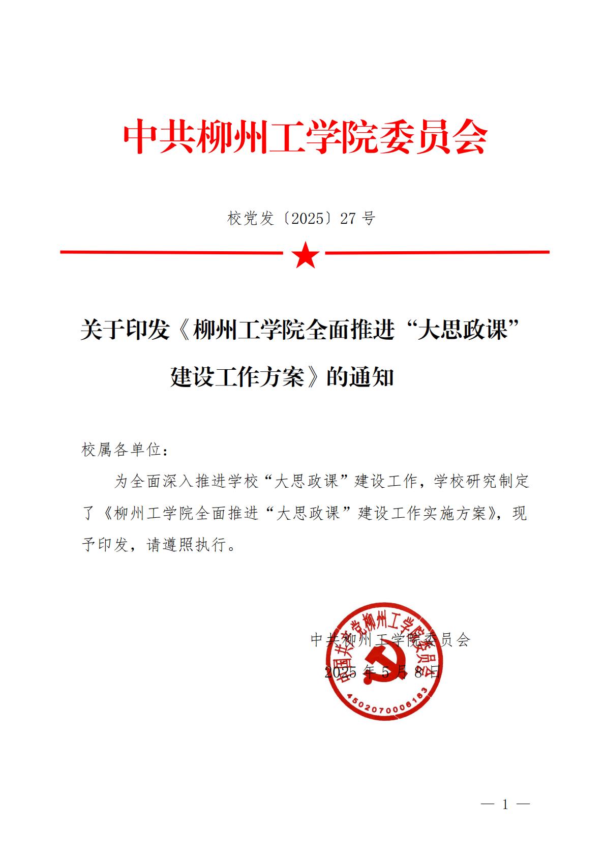 校党发〔2025〕27号关于印发《柳州工学院全面推进“大思政课”建设工作方案》的通知