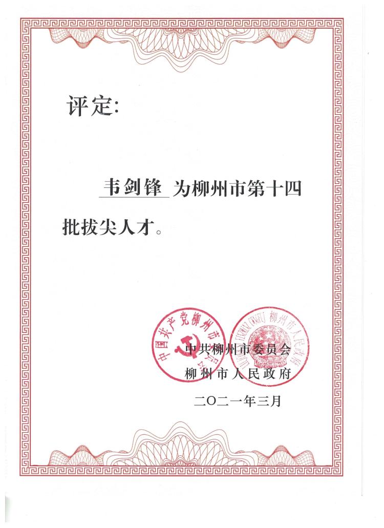 近日,中共柳州市委员会、柳州市人民政府颁发了“柳州市第十四批拔尖人才”荣誉证书,我院食品科学与工程教研室韦剑锋老师获此殊荣。