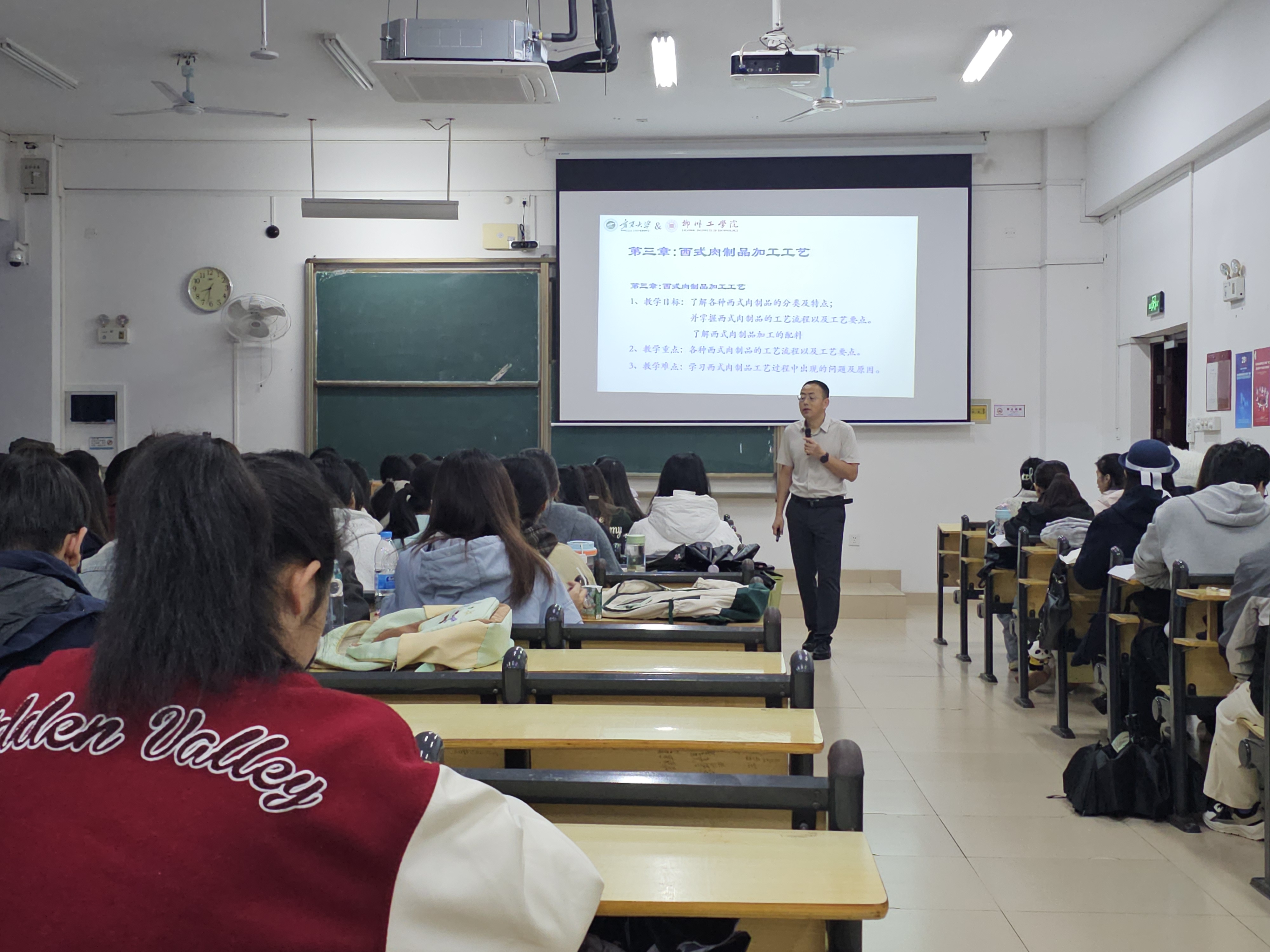 11月18日,食品与化学工程学院“A”类柔性教师刘贵珊教授在2教211教室呈现了一堂精彩的《食品工艺学》公开课。本次课程以“肉及肉制品加工工艺”为主题,重点聚焦于西式肉制品加工的理论知识与实践应用。刘教授凭借深厚的学术积淀与丰富的行业经验,通过生动的案例解析,系统阐释了西式肉制品加工的核心工艺与科学原理,为同学们揭开了西式肉制品加工业的技术面纱。