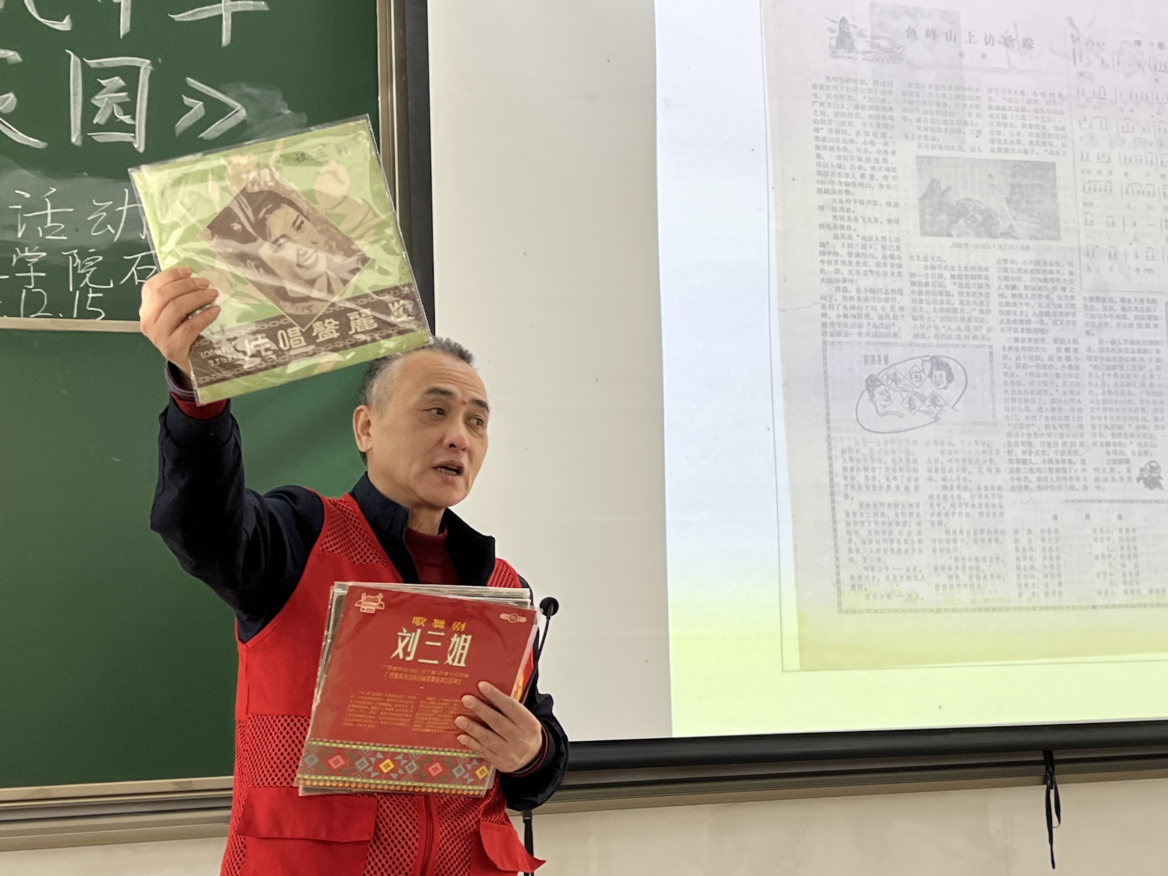 在本次讲座中,两位老师对刘三姐山歌文化的内涵、历史渊源、艺术特色以及其在中华民族文化中的重要地位与价值进行了深刻的讲解与剖析。活动过程中,江老师把自己收藏的刘三姐相关珍贵唱片和剧本展示给大家,那一张张微微泛黄的唱片仿佛在诉说着往昔岁月里刘三姐歌声回荡在山水之间的盛景,泛黄的剧本上的文字则记录着刘三姐山歌文化的传承脉络。