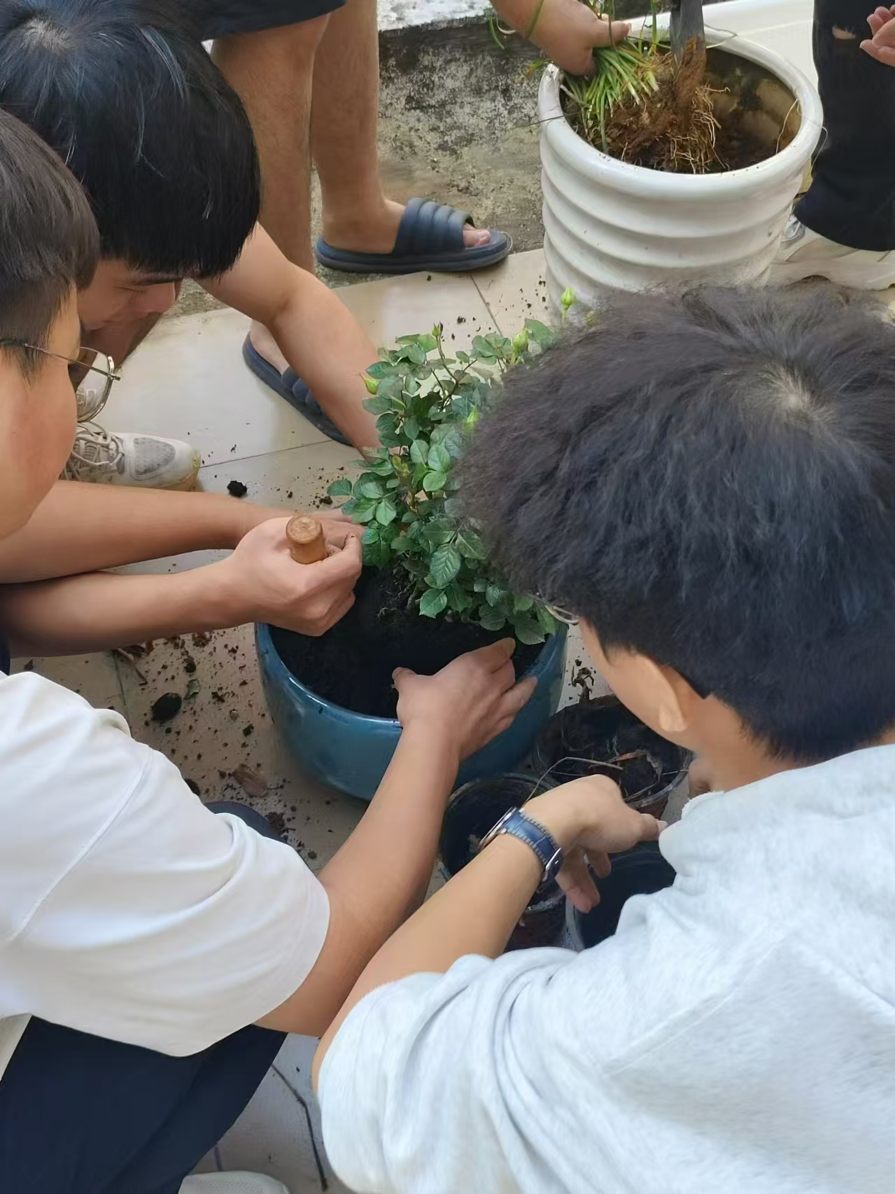 在心理工作站干事的组织下,大家马上进入劳动状态,分工明确,有的负责挖土挖坑,有的负责移植植株,有的负责浇水施肥,每一个环节都进行得有条不紊。活动现场,同学们相互协作、交流经验,共同探讨如何科学种植,提高幼苗存活率和种子的发芽率。经过一个半小时的辛勤努力,平台前增添了各种各样的绿植和蔬菜苗,有葱花、蒜、油麦菜等等。看着自己亲手种下的希望之苗,大家的脸上洋溢着满足和期待的笑容。在活动中,各个小组紧密合作,展现出了强大的团队精神;利用双手进行劳动体验,培养了耐心和责任感,体会到劳动的价值和意义;通过对不同幼苗的种植,同学们亲身感受到了大自然的规律和生命的循环,从而发自内心地尊重生命、敬畏生命;共同劳作还促进了同学们的交流,增进了彼此间的了解和友谊。