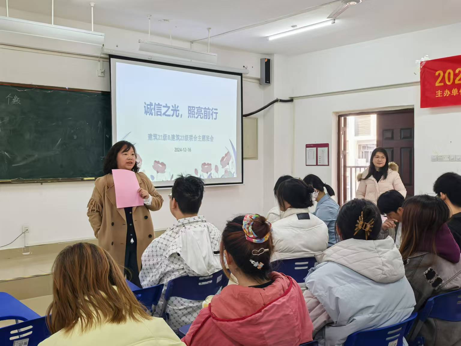 2024年12月16日下午,建筑21级和建筑23级联合开展了以“诚信之光·照亮前行”为主题的班会活动,此次活动旨在引导大学生树立正确的价值观和道德观,为他们的未来发展奠定坚实的诚信基础。班会由建筑211班班主任尹佳老师主持,班会围绕诚信的内涵和重要性进行了深入讲解,从诚信之基、学业之诚、发展之信、社会之责四个方面进行了全面阐述。强调了诚信在学术诚信、学费缴纳、助学贷款和就业等方面的具体体现,鼓励同学们在日常生活和学习中践行诚信原则。