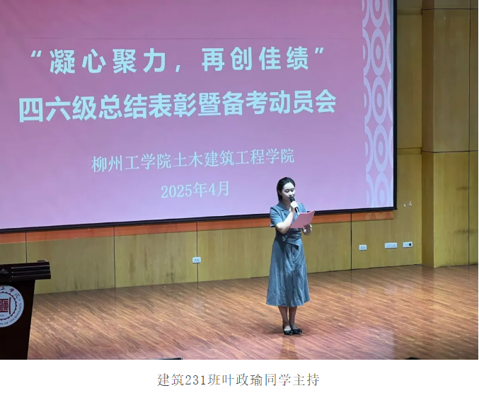 为总结英语四六级考试经验,表彰先进典型,进一步激发学生学习热情,以优良学风迎接学校本科教学合格评估,4月21日晚,土建学院在学术报告厅隆重召开2024-2025学年英语四六级总结表彰暨备考动员会。土建学院党总支书记韩泳、副院长(主持工作)曾丽群、语教学院赵丹老师、各教研室主任及23-24级全体辅导员和学生代表参加会议。会议由建筑231班叶政瑜同学主持。